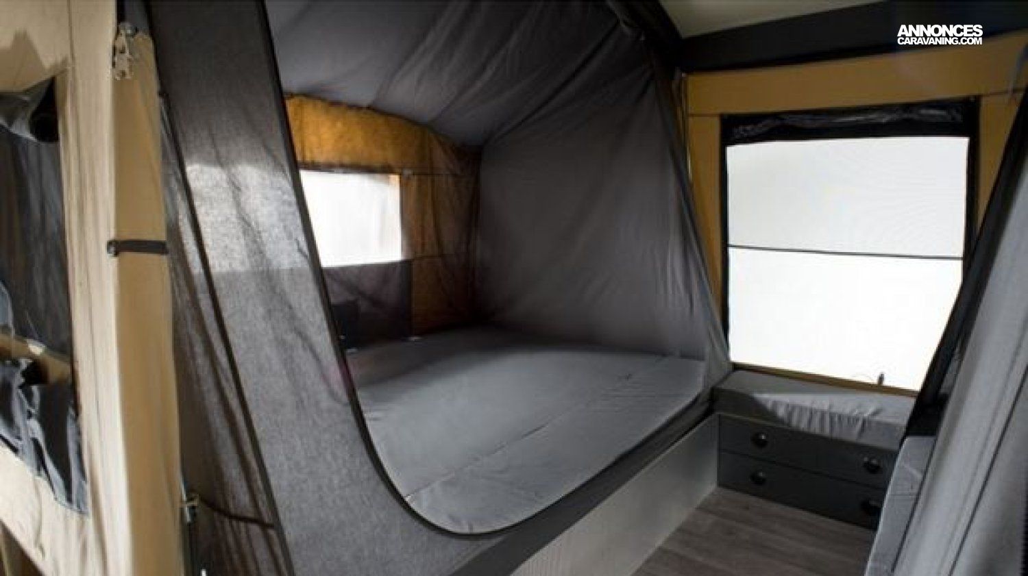 Cette caravane pliante vous assurera un confort intérieur en toutes circonstances grâce à sa grande fenêtre cuisine avec moustiquaire et volet pour une aération optimisée. Très grand séjour sous l’auvent, 2 chambres séparées offrant des couchages surélevés avec sommiers et matelas intégrés, de multiples rangements astucieux cousus dans la toile. Sous les plateaux de lits, vous pourrez ranger tout ce dont vous avez besoin pour votre séjour en camping ou créer des couchages d’appoints complémentaires grâce aux tentes intérieures en option
