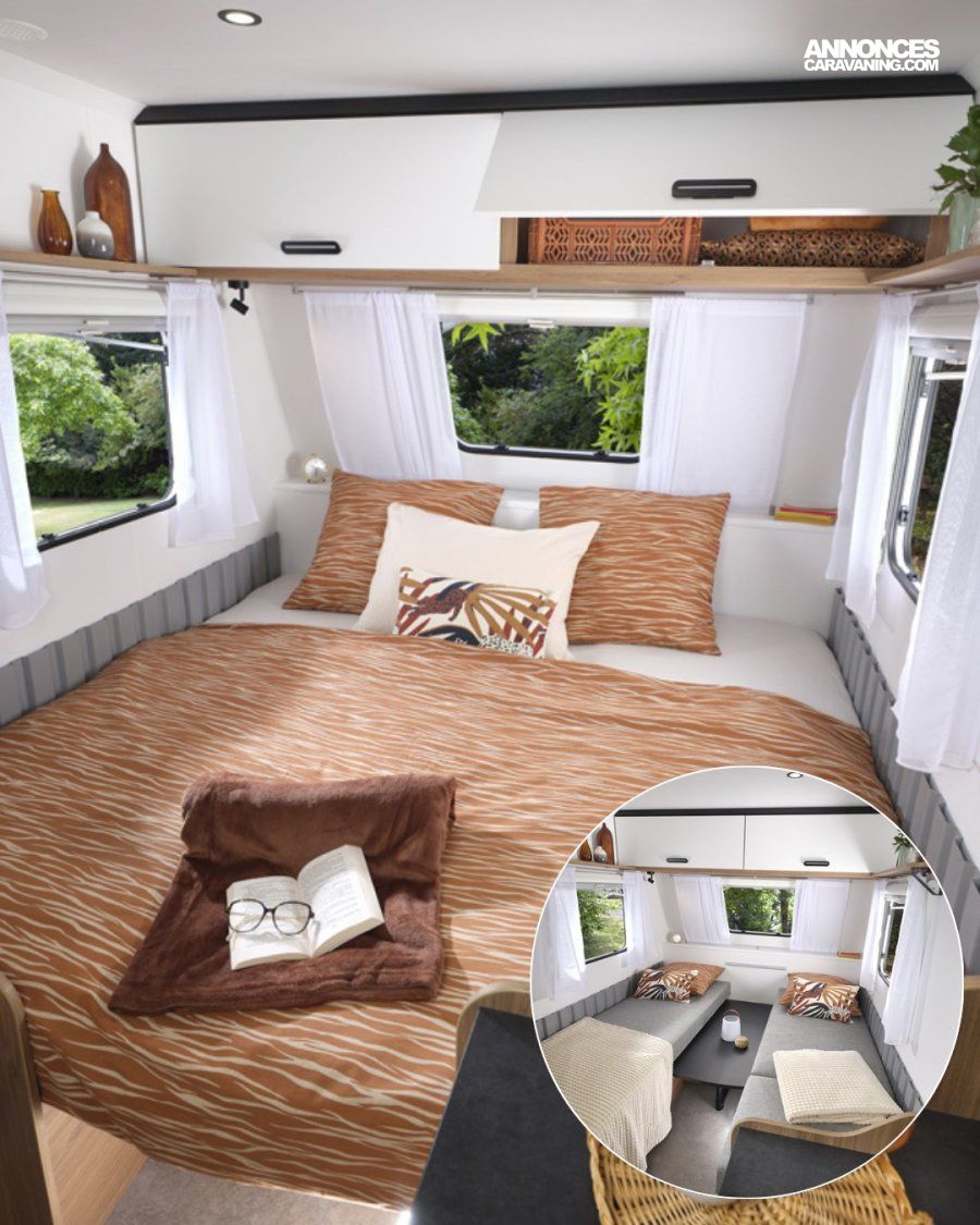 Caravane TOP EQUIPÉE (Antilacets, Amortisseurs, Roue de secours, Vérins renforcés, Portillon extérieur latéral, Lanterneau panoramique, Moustiquaire de porte, Spots de lecture lit parents…)