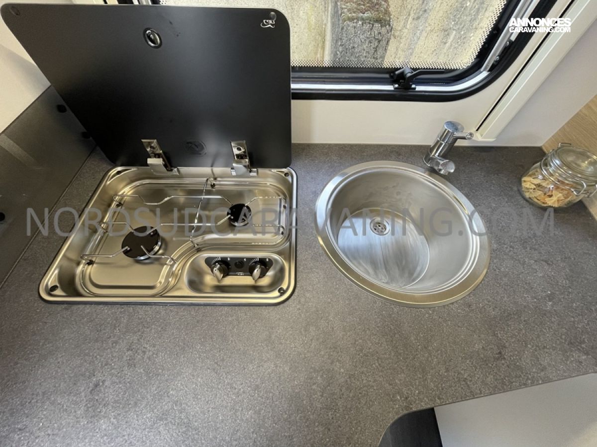 Elle possède une cuisine avec plaque de cuisson réchaud 2 feux, un évier inox, un réfrigérateur à compression ainsi que de nombreux rangements. Un coin toilette avec WC à cassette, bac de propreté et douchette. Elle dispose côté chambre d’un lit transversal permanent pour 2 personnes et sa dinette se transforme en couchage.