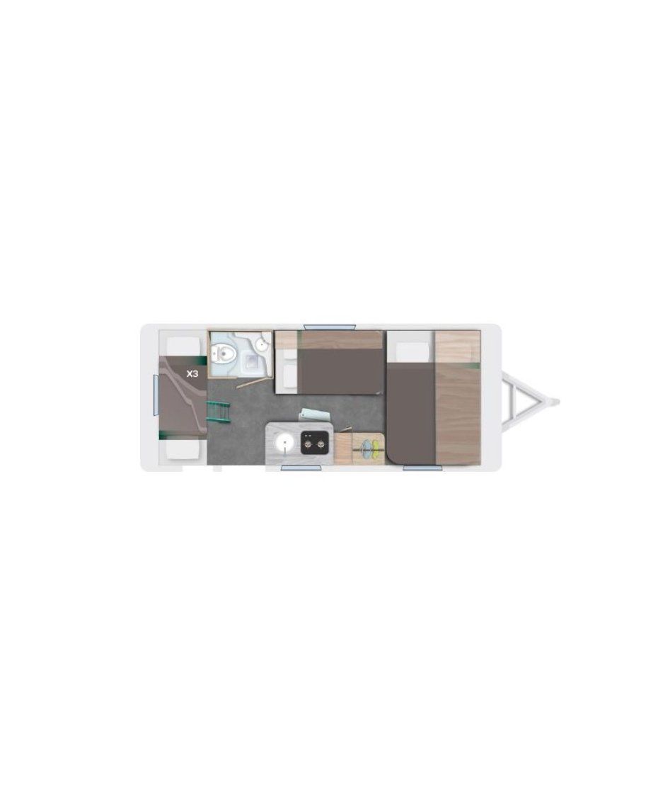 Grâce à ses trois lits superposés à l'arrière cette caravane répond parfaitement aux besoins des familles nombreuses. A l'avant un grand lit, au centre une dinette transformable mais aussi un frigo XL et de nombreux rangements.