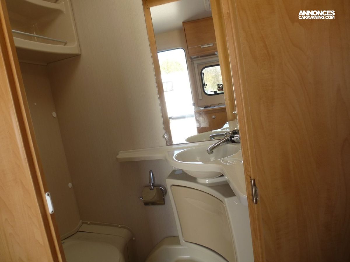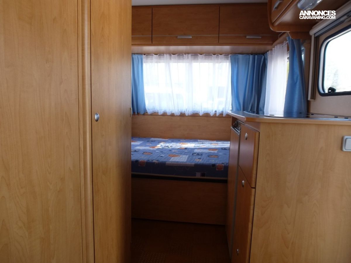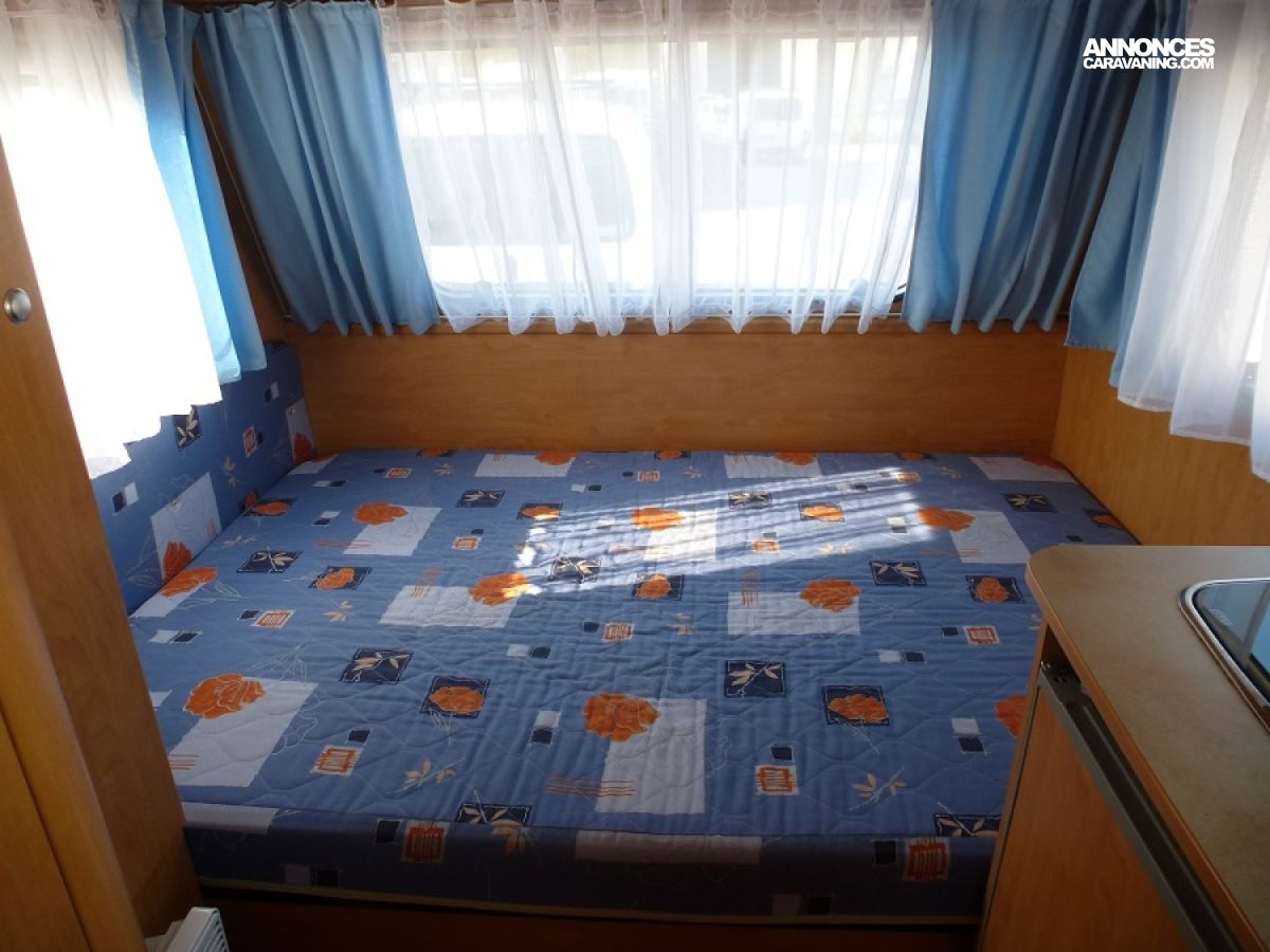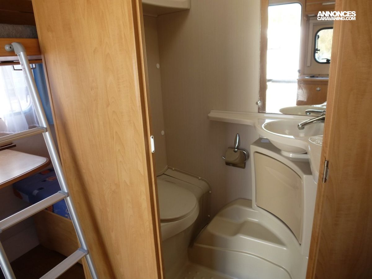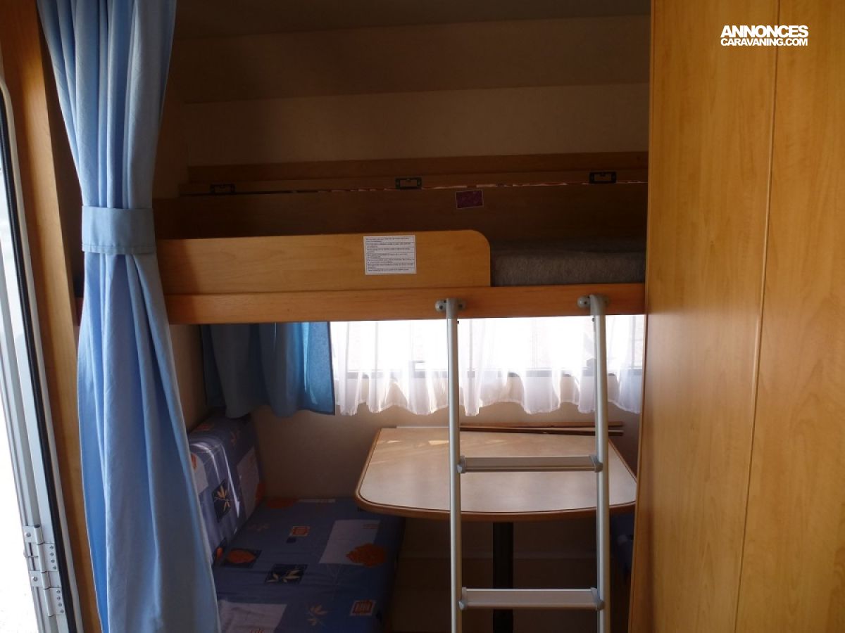 Son coin dinette lumineux et chaleureux se transforme en couchage avec au-dessus un lit superposé escamotable permettant l’accueil de deux enfants. Elle possède également une penderie, un coin cuisine avec combiné réchaud 3 feux et cuve évier inox avec couvercle en verre, un réfrigérateur 12/220/gaz, un coin toilette avec WC à cassette et bac de propreté ainsi que de nombreux rangements.