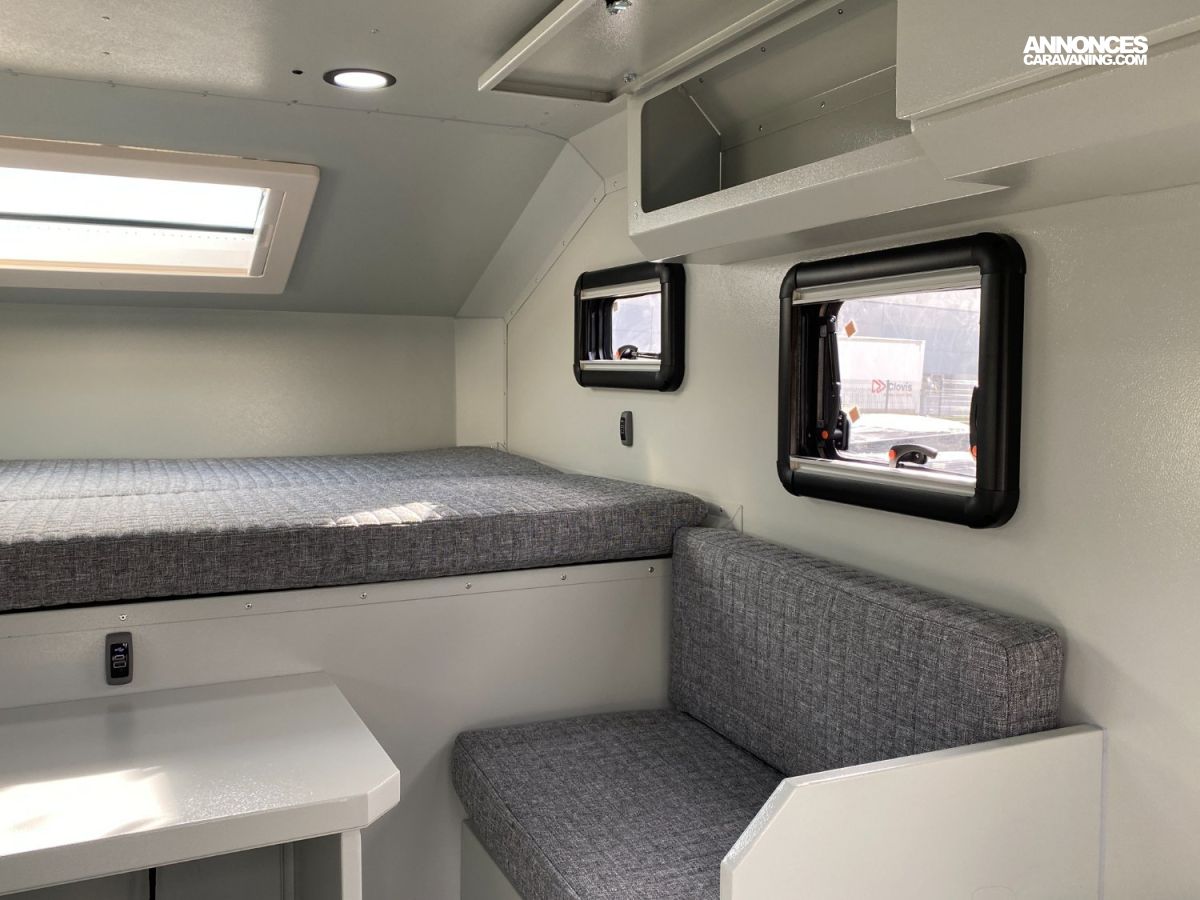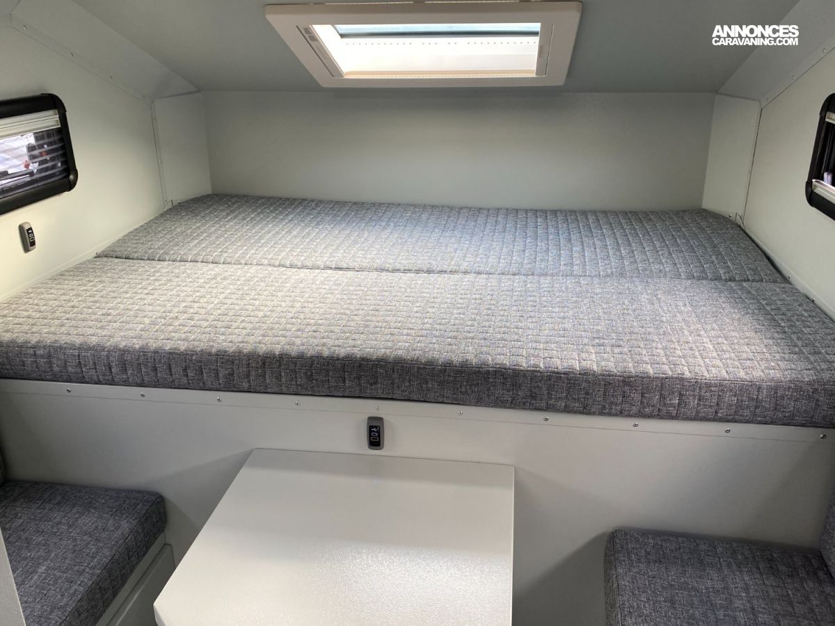 Couchage principal : 193 × 130 cm + banquettes 80 × 47 cm et table 50 × 54 cm.