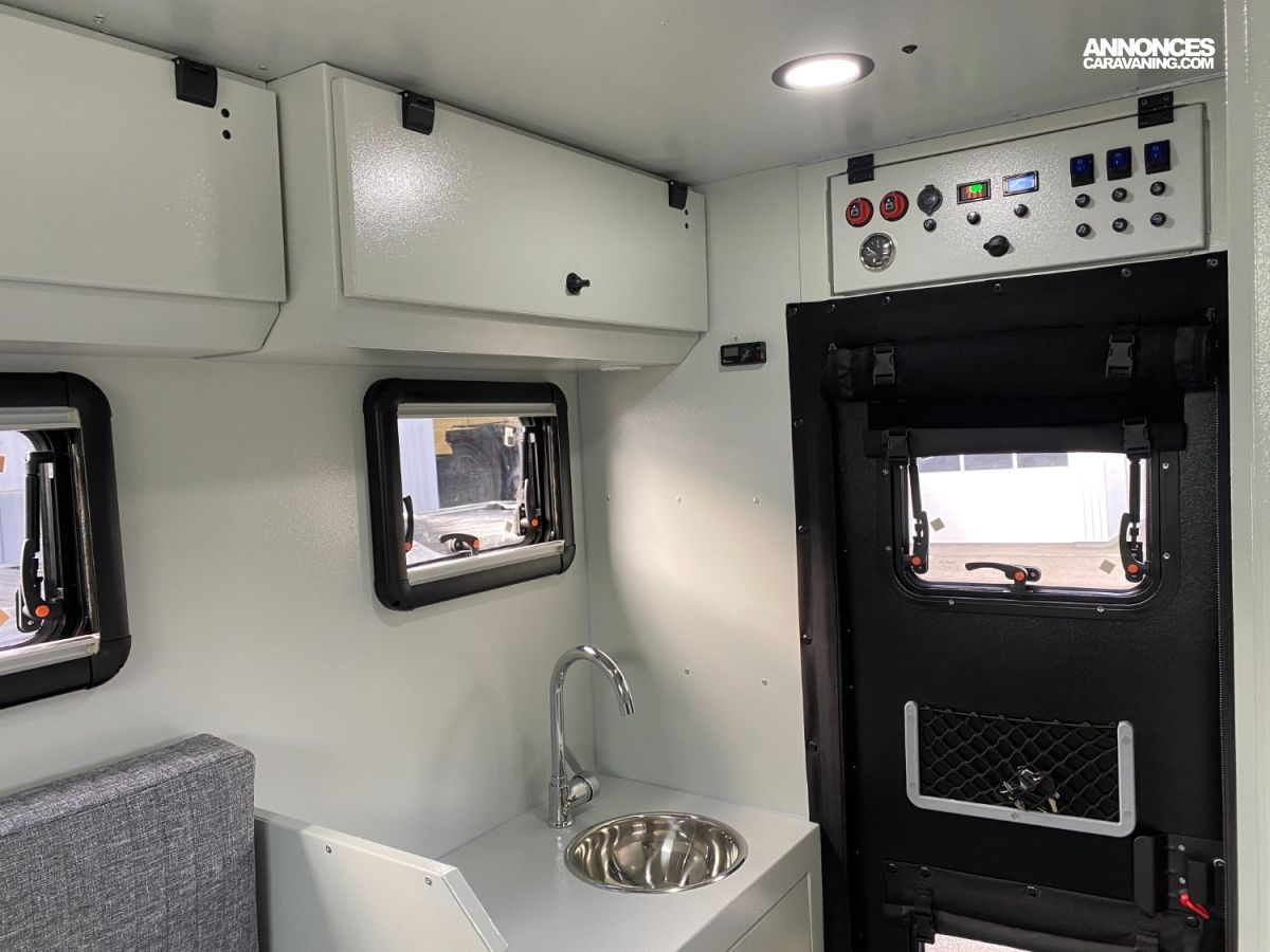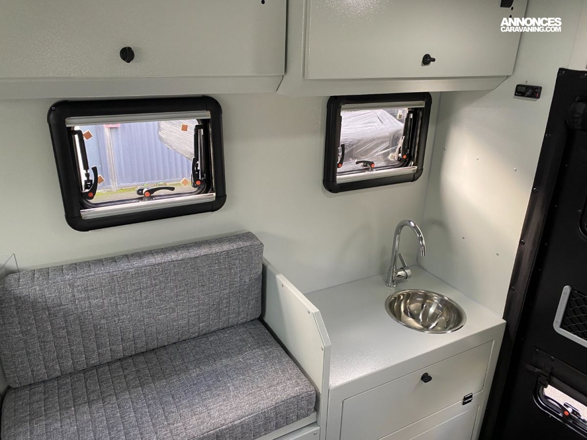 Cuisine équipée : évier avec mitigeur, petit plan de travail, rangements, frigo 12 V (en option).