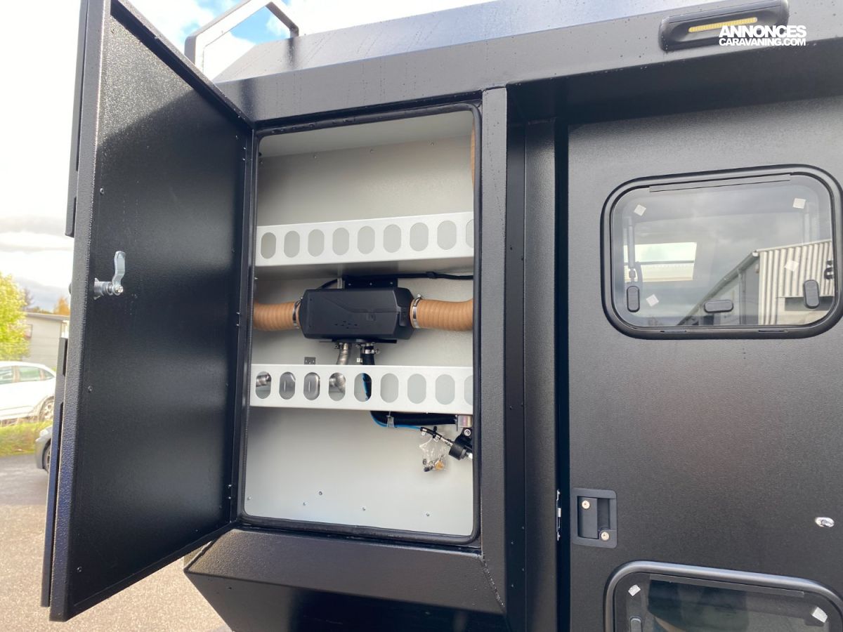 Panneau de contrôle complet avec prises 12 V, USB et 220 V, voltmètre et thermomètre numériques.
