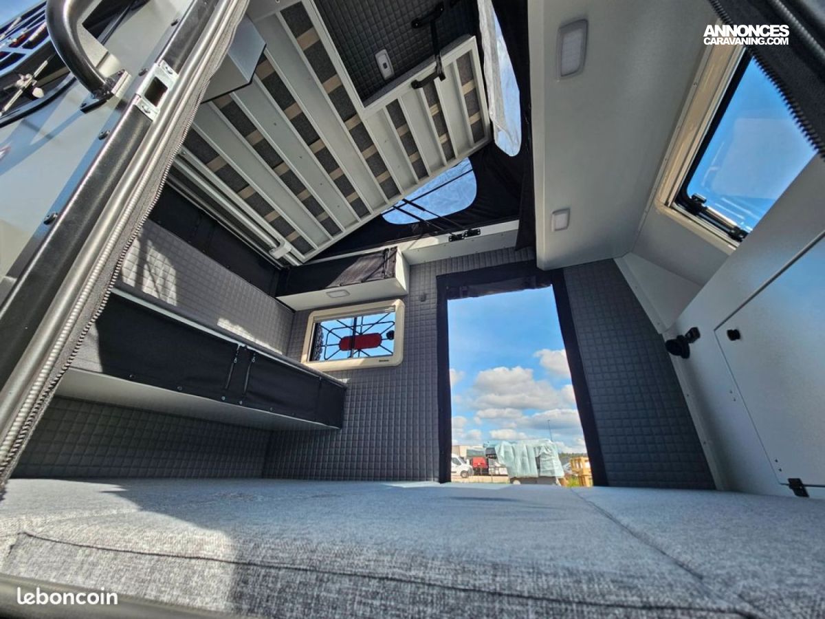 .Équipements de la cuisine extérieur :1 brûleur à gaz, évier avec mitigeur couleur chrome, petit plan de travail, des rangements, 3 prises 220 V, 2 prises USB et 1 prise 12 V allume cigare.