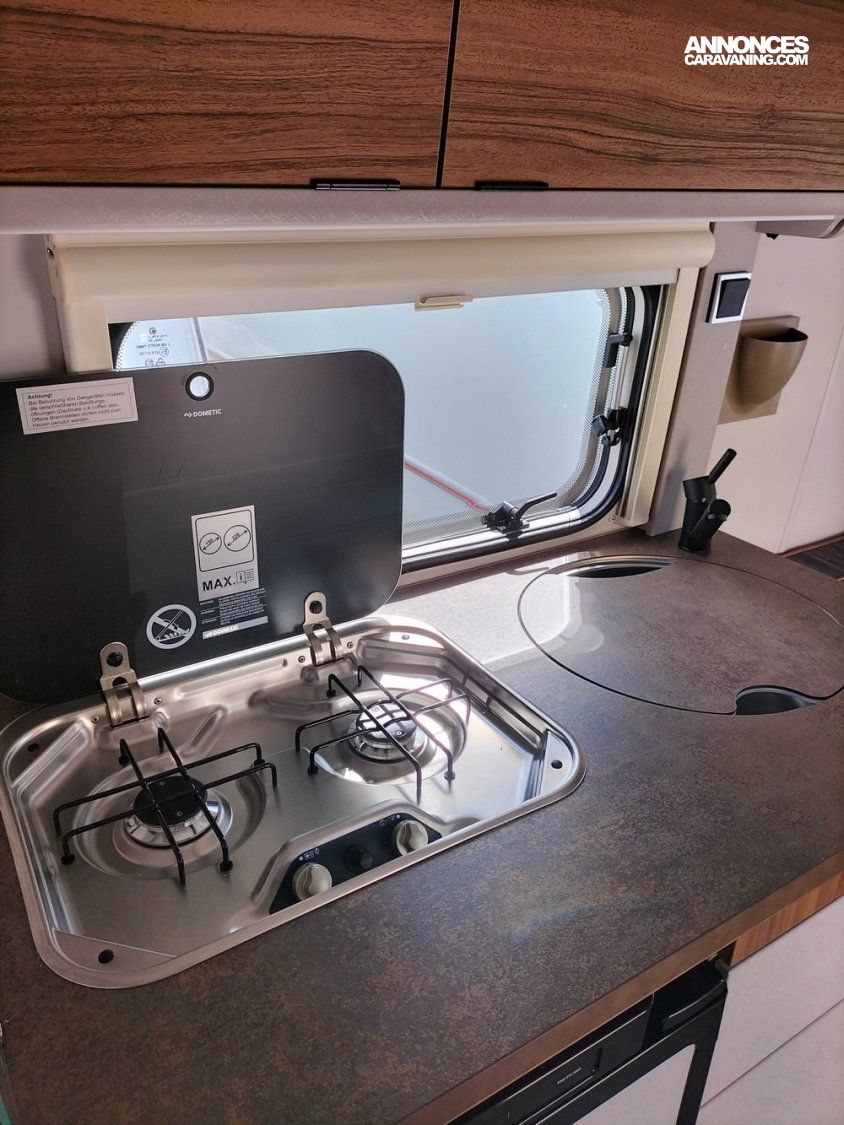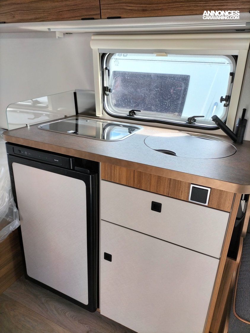 Augmentation de PTAC 1050 kg / Porte vélos / Roue de secours + support / Trappe arrière coté droit / Tissu Wellington / Compartiment multifonction dans la cuisine assortir aux couleur du séjour / Réfrigérateur à absorption 81 L avec freezer inclus / Couverture pour timon / Vérins stabilisateurs galvanisés / Réchaud 2 feux avec couvercle en verre / Paroi anti-éclaboussures en verre / Rallonge de plan de travail rabattable