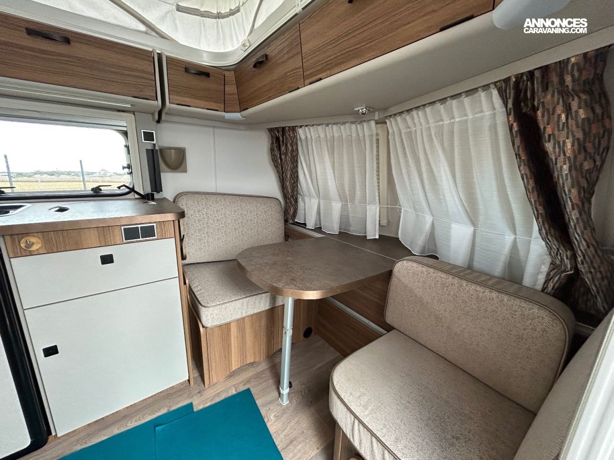 Lit tout fait à l'arrière , cuisine et penderie latérales et petite dinette transformable en lit à l'avant .
