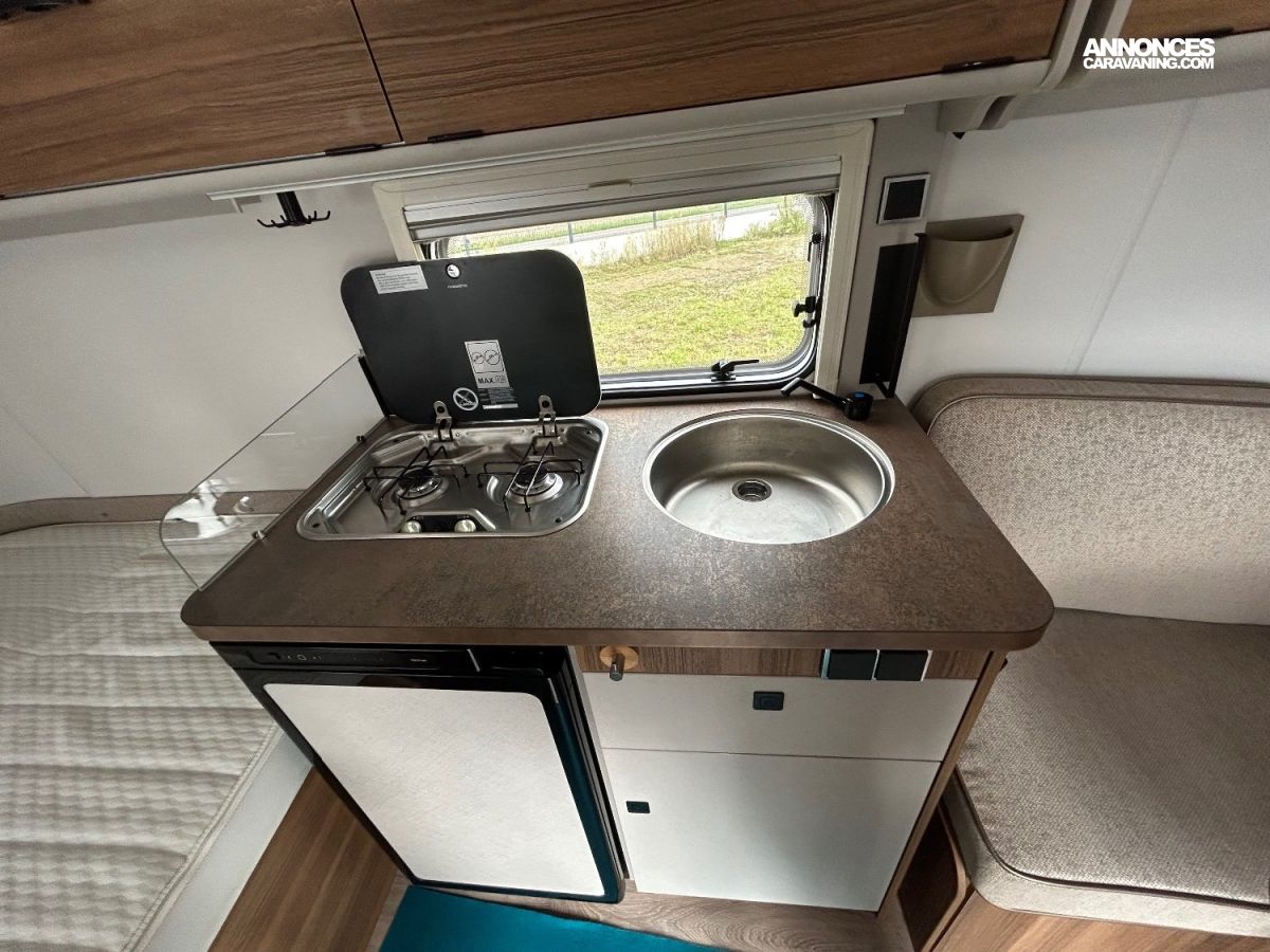 Elle est équipée de son chauffage , son réfrigérateur, son réservoir d'eau fixe de 30 litres , sa trappe supplémentaire arr .