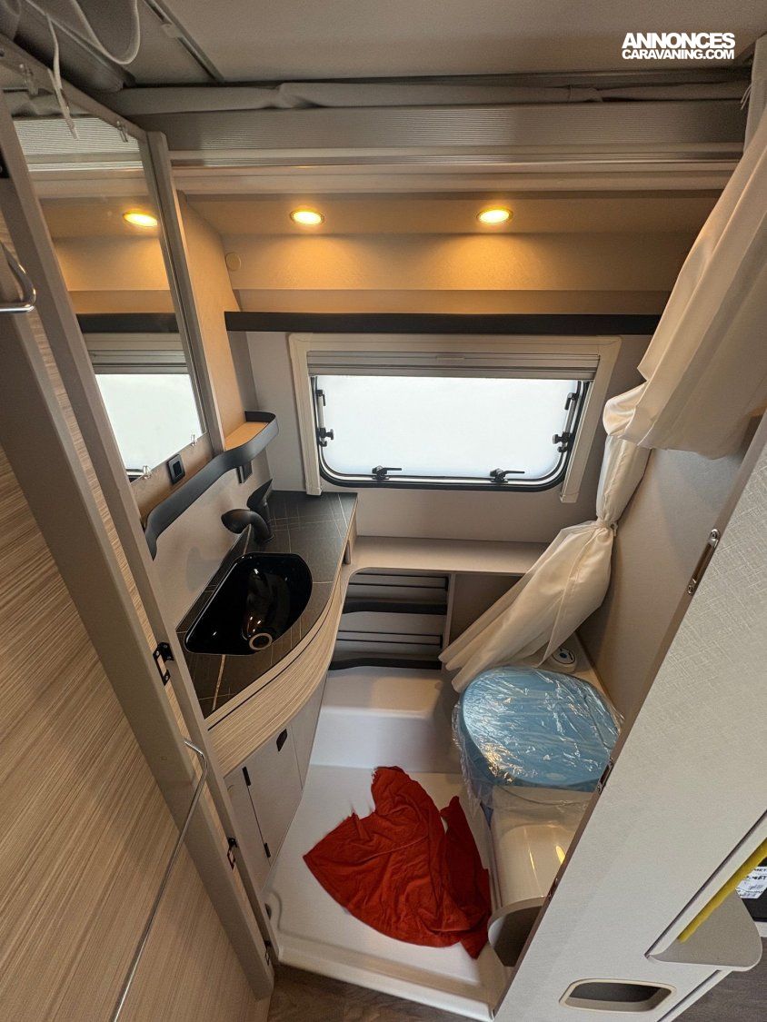 Moustiquaire sur toute la hauteur de la porte à usage facile grâce au guidage latéralStores plissés confortPrises supplémentaires (2 x 230 V et 1 x USB double)Poubelle intégrée à la porte celluleCouvercle d’évier avec planche à découper pour évier en acier inoxydableMiroir grossissant avec fixation magnétiquePack design