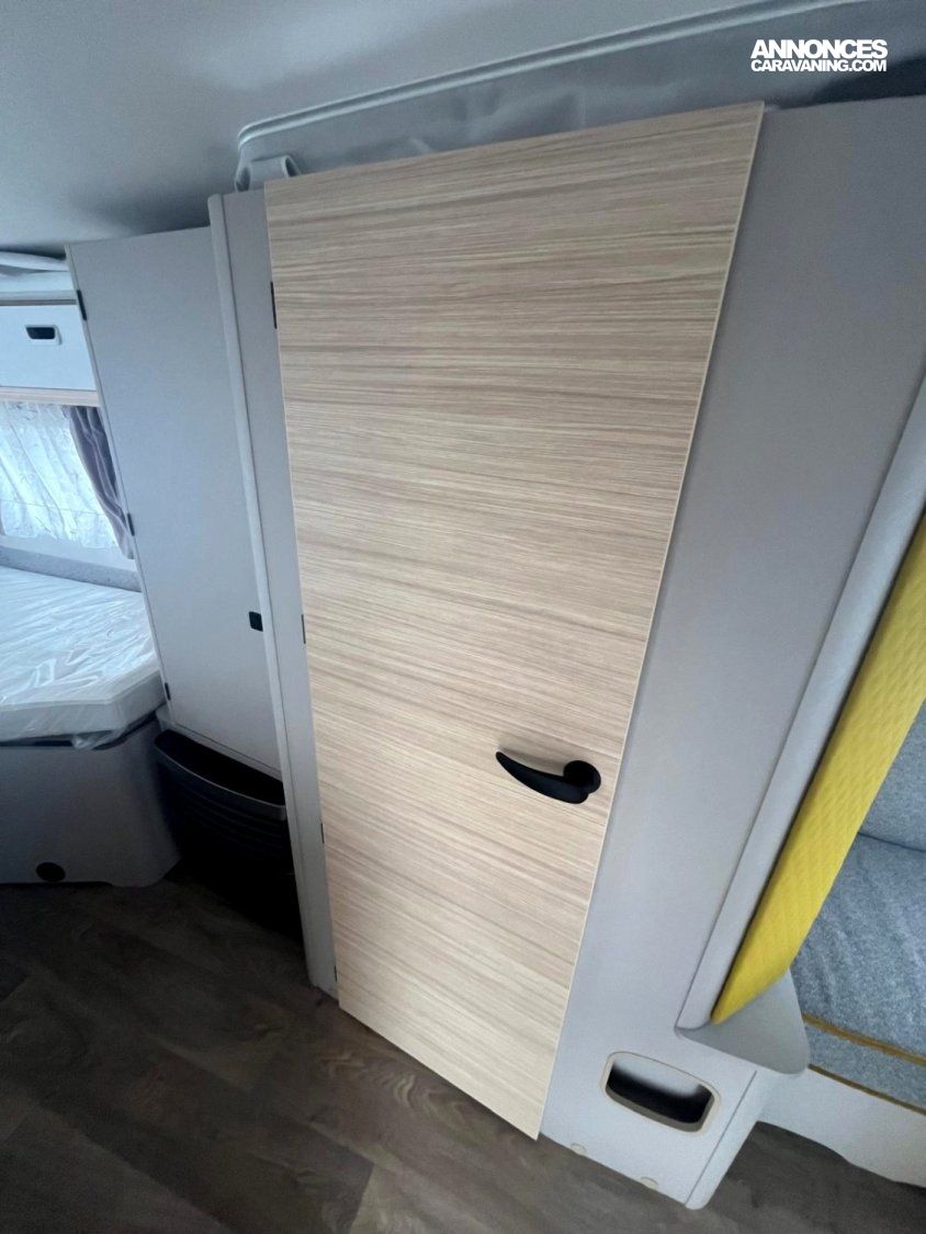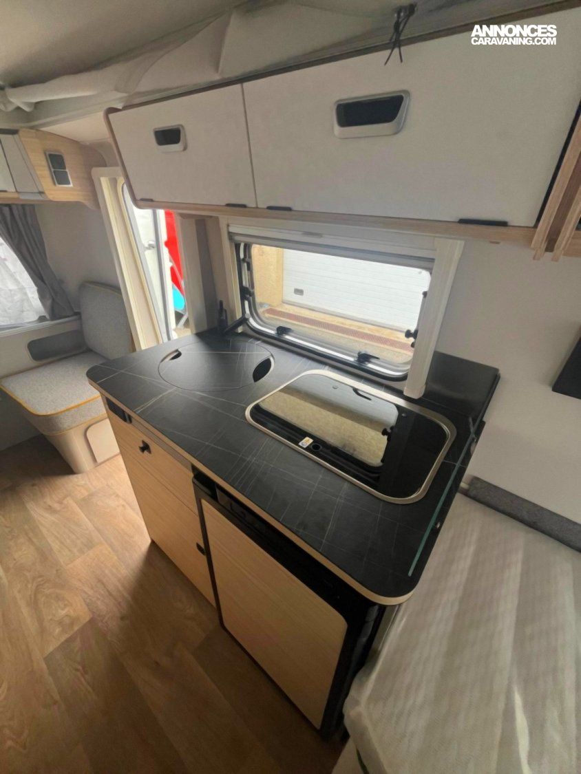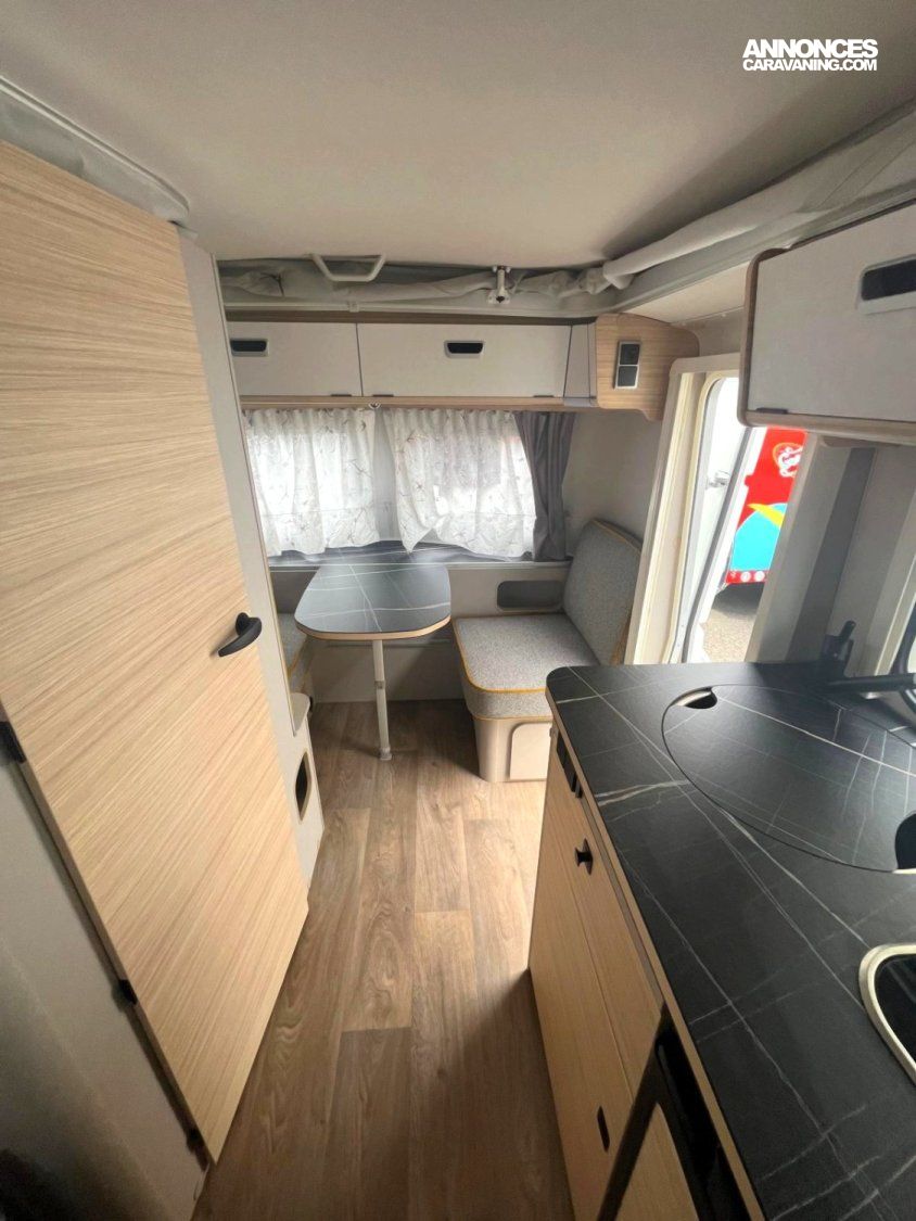 Équipé du PACK NUGGET / PACK CONFORT / Trappe extérieure arrière droite / Pommeau de douche télescopique + barre et rideau de douche / Réservoir eau propre 30 L / Chauffe-eau Truma Therme 5 L / Coussins confort pour dinette avant / Roue de secours en aluminium