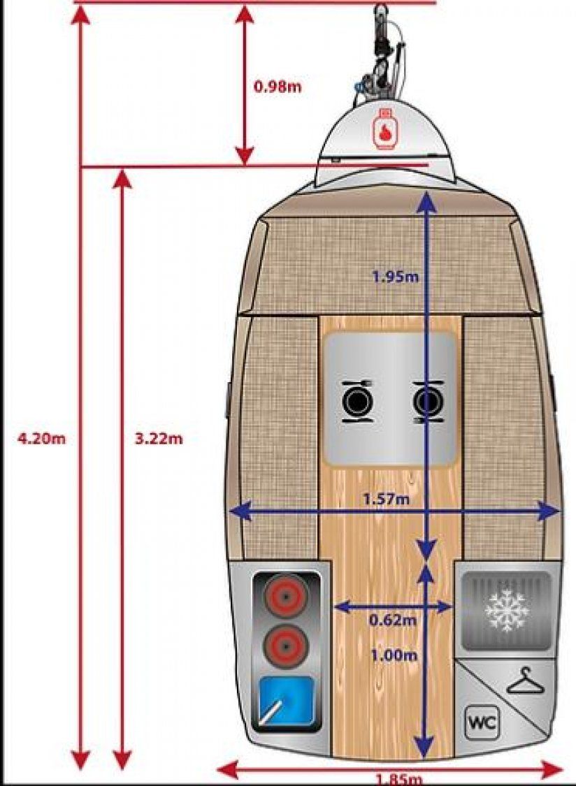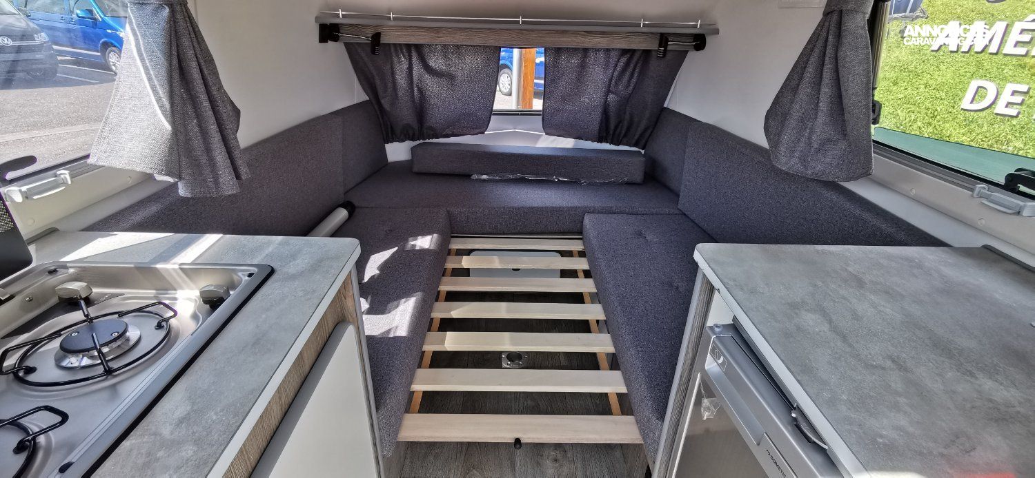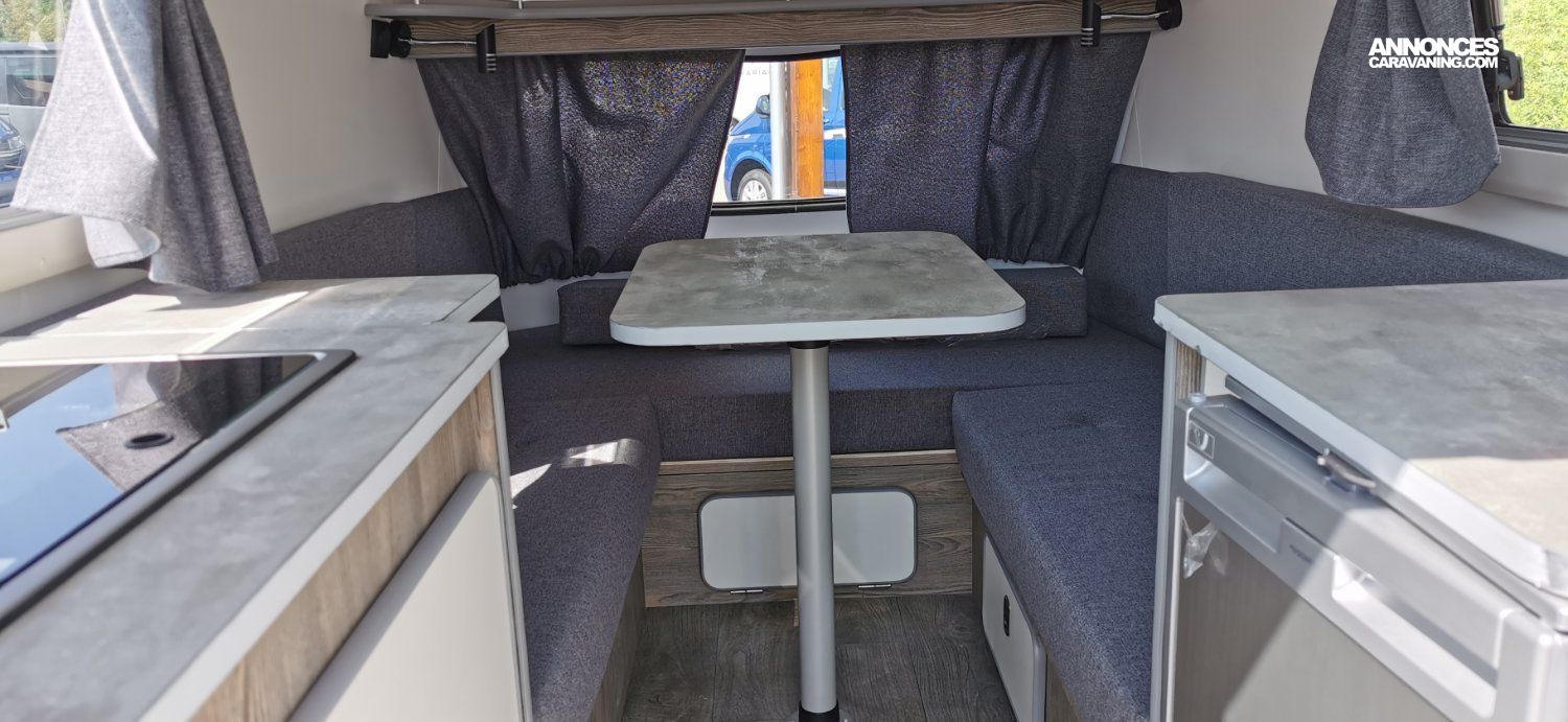 Le mini toit relevable (toit champignon), permet de se tenir debout devant les rangements principaux et de cuisiner facilement.