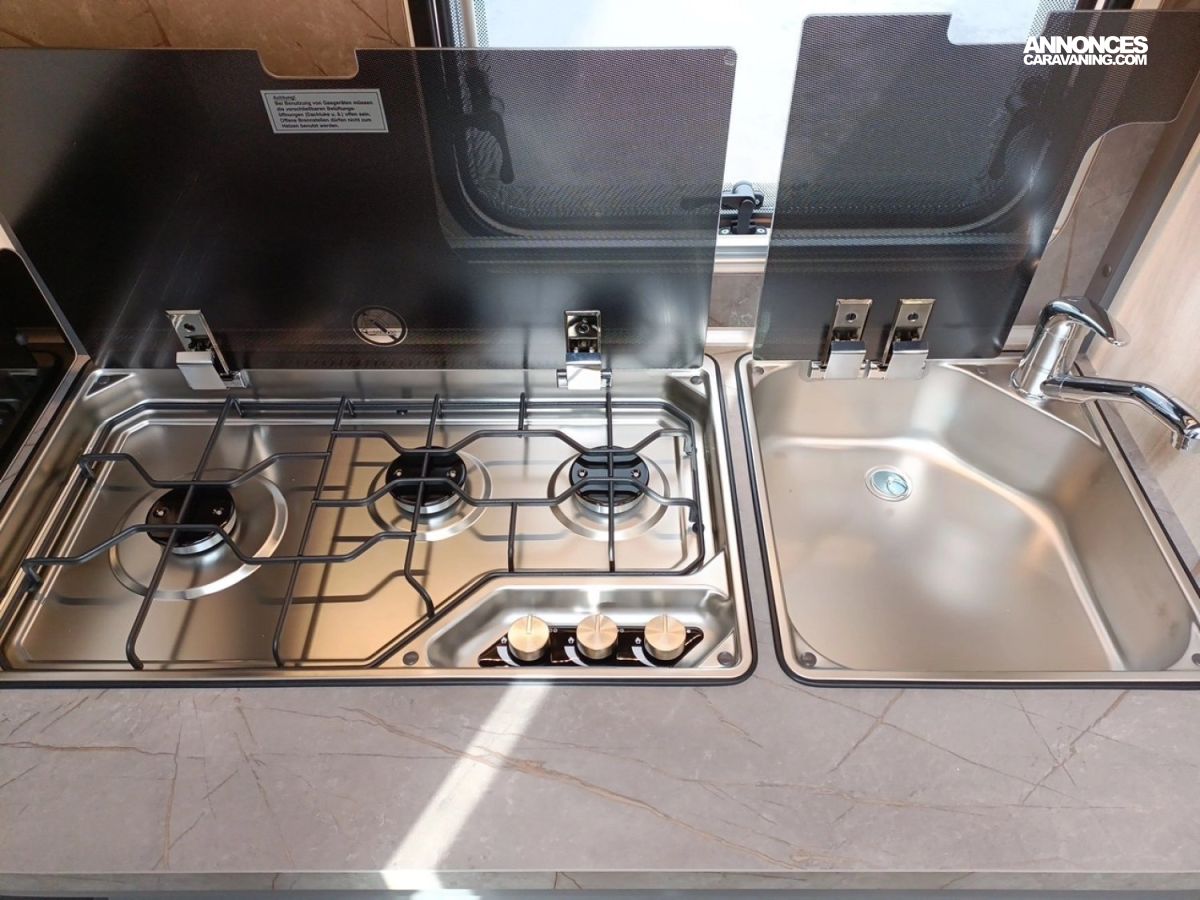 Réchaud et évier en inox, avec 3 feux, allumage électrique et abattant verre en deux parties