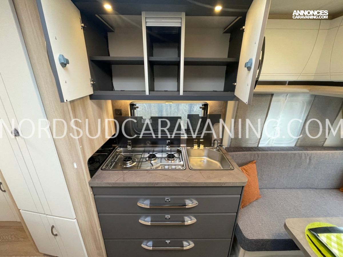 Pratique avec ses nombreux rangements, elle est très fonctionnelle avec sa cuisine équipée d’un réchaud 3 feux et évier inox protégés par un couvercle en verre et d’un réfrigérateur à absorption 133L.