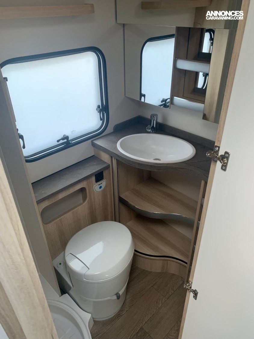 Réservoir d’eau propre fixe avec indicateur de niveau , WC cassette avec rinçage électrique, Lavabo et salle d’eau séparé, Réservoir d’eaux usées à roulettes Combi ,Chauffage gaz air pulsé/Chauffe-eau 10l truma 6 Stabilisateur anti-lacet /Cache flèche /Amortisseurs /Toit renforcé.