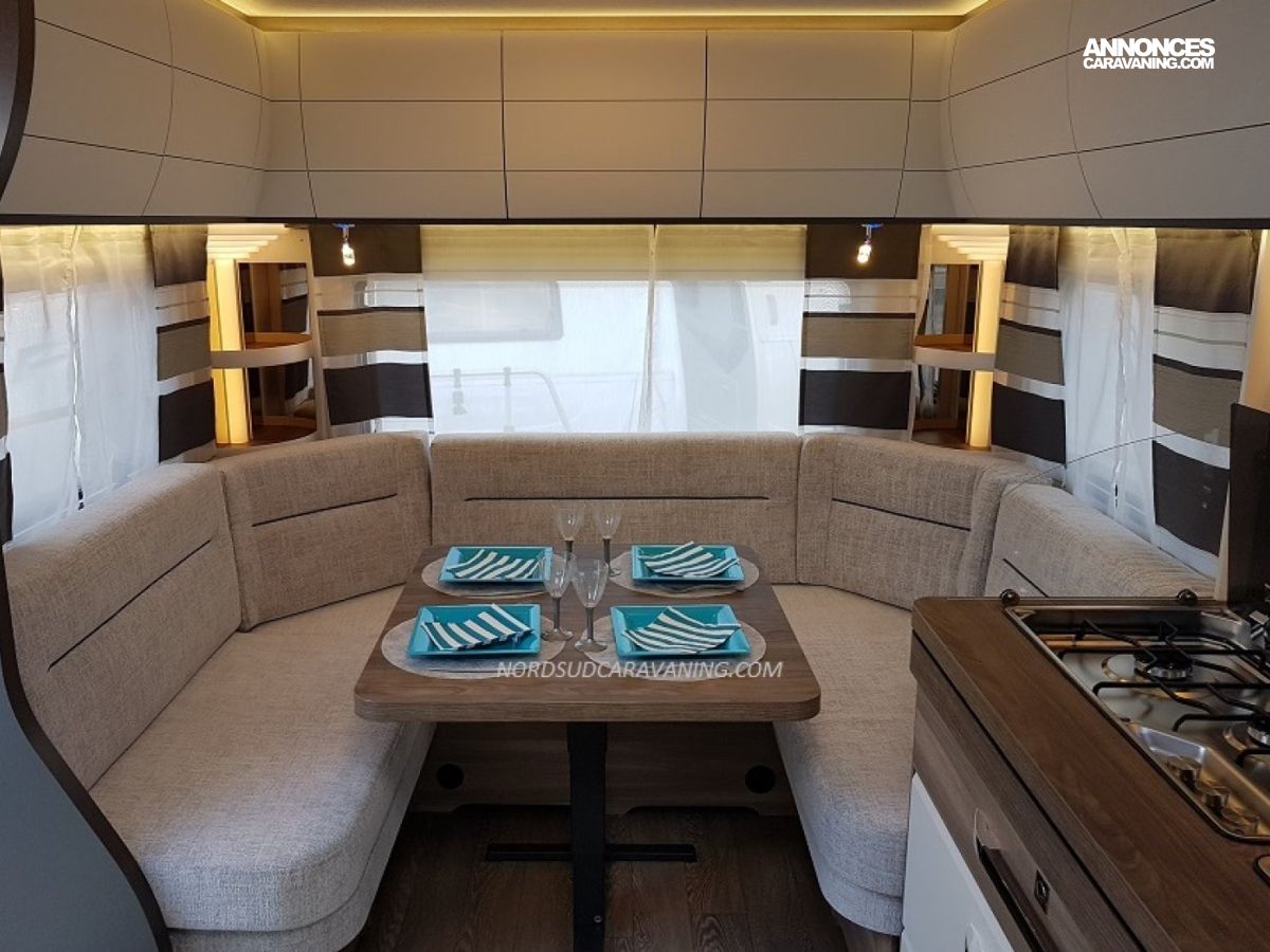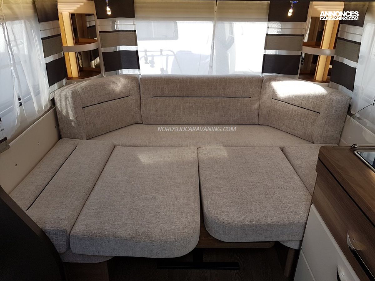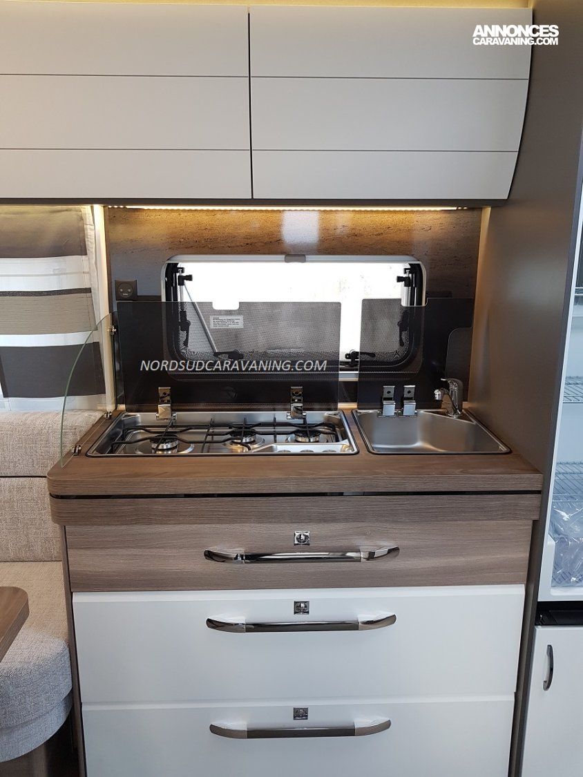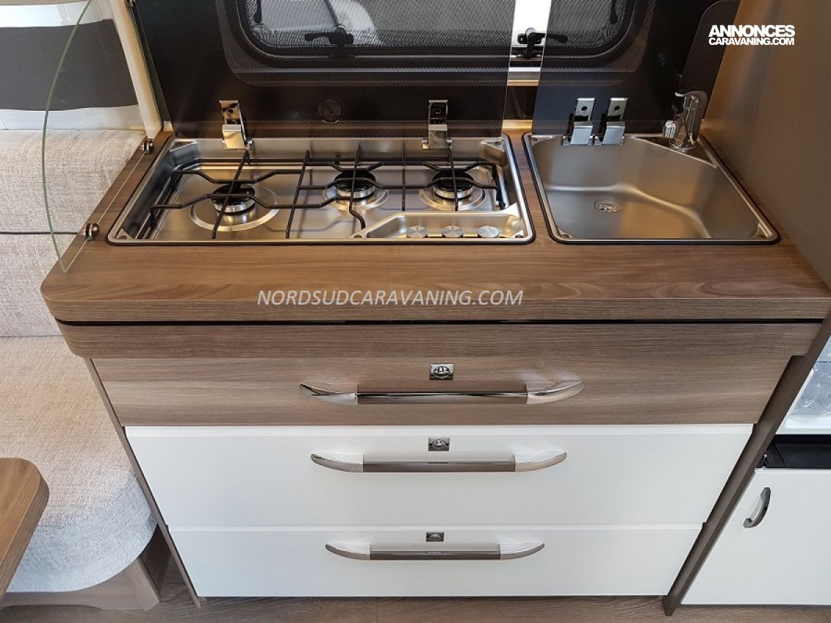 Cette superbe caravane est dotée d’un joli salon en U spacieux et convivial pour en profitez en couple, en famille ou entre amis. Il est transformable en couchage pour deux personnes. Son lit central vous permettra de profiter d'un espace de repos confortable facilement accessible des deux côtés et avec de multiples espaces de rangement. Sa cuisine équipée d’un réchaud 3 feux, d’un évier, d’un réfrigérateur congélateur avec double ouverture, qui ravira le cuisinier ou la cuisinière. Elle dispose également d'une salle de bain compacte, équipée d’un WC, d'un lavabo et d'un bac de propreté qui vous apportera un maximum de confort.