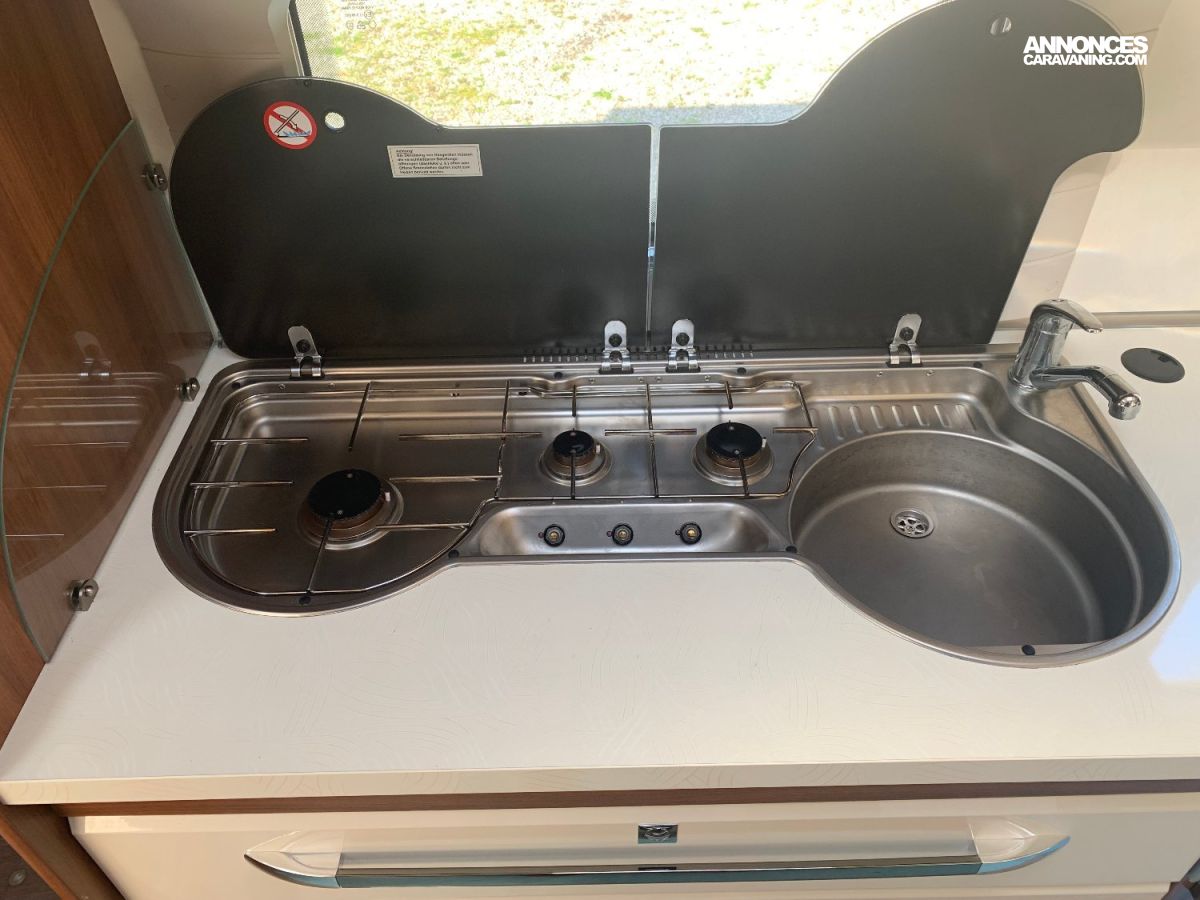Cuisine 3 feux, évier, rangements, frigo Tri Mix 133L avec bac congélation.