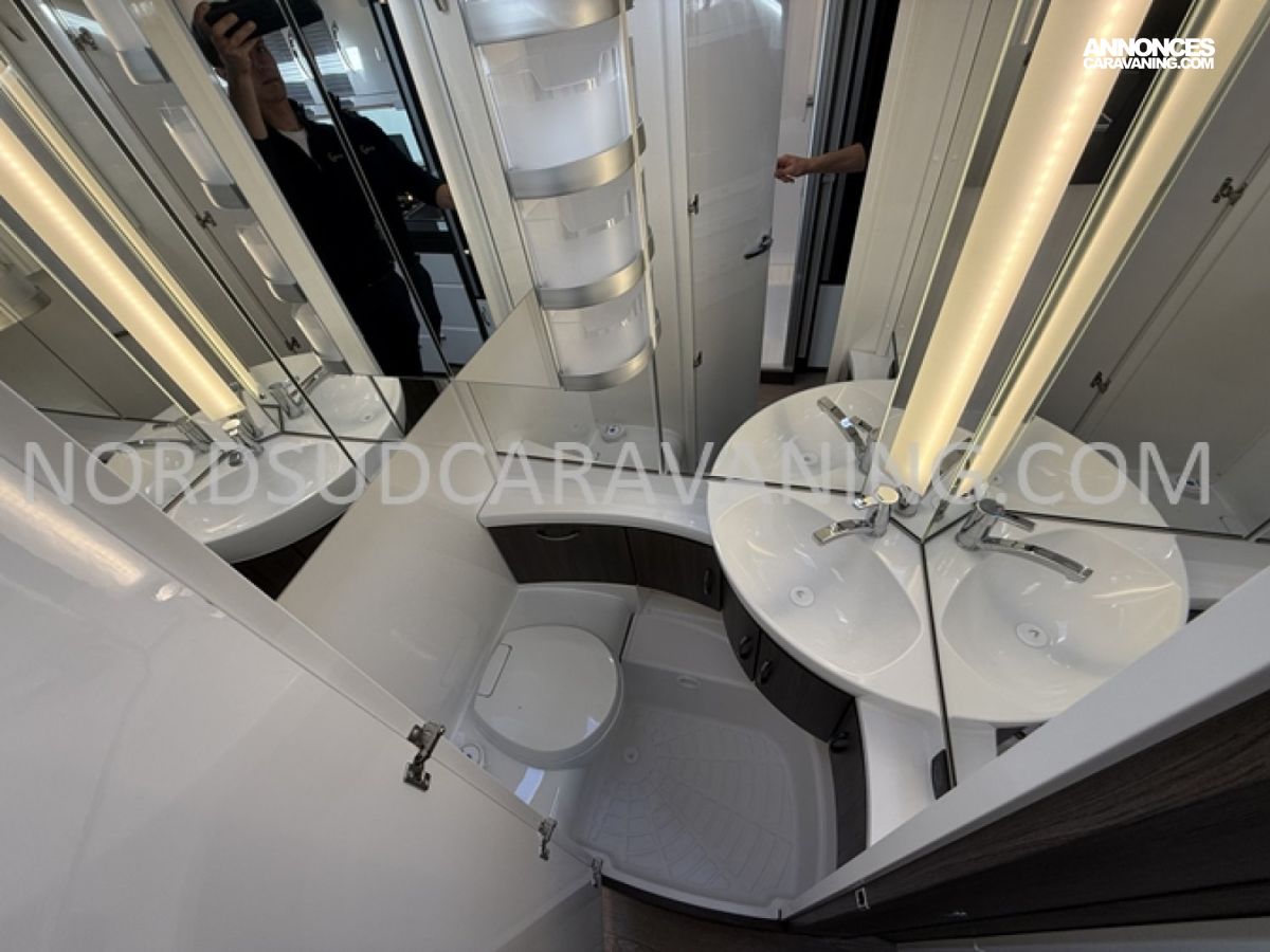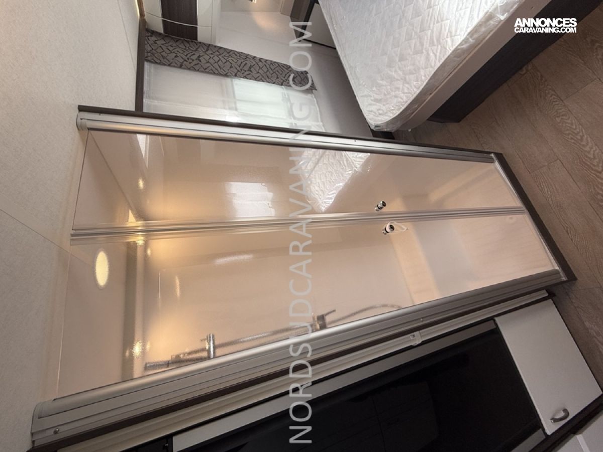 Cette caravane allie place, confort et rangements. Son lit central est confortable et facilement accessible et vous disposez en outre d’un maxi salon en U transformable en couchage d’appoint. Sans oublier sa salle de bain spacieuse avec cabine de douche séparée, Lavabo et WC à cassette.