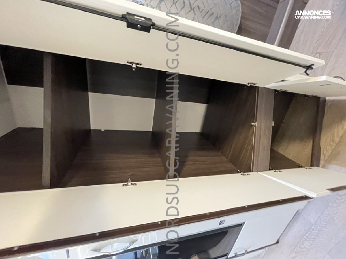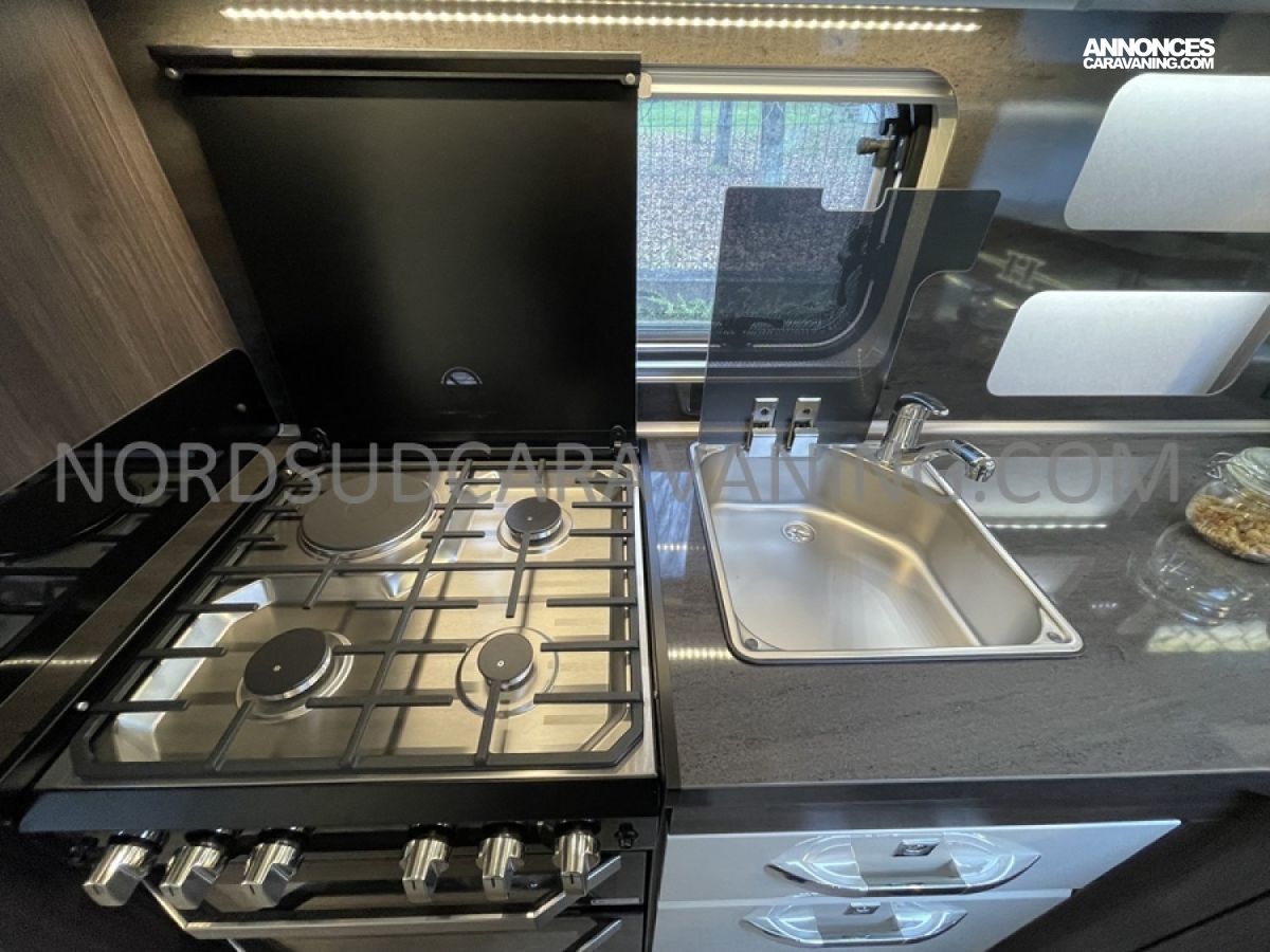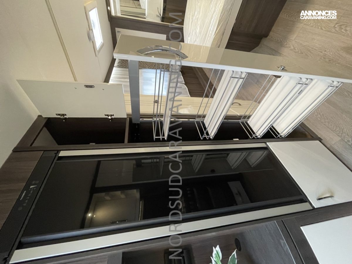 Pratique avec ses nombreux rangements, elle est très fonctionnelle avec sa cuisine équipée composée d’un réchaud 3 feux et évier inox protégés par un couvercle en verre et d’un réfrigérateur à absorption 133L.