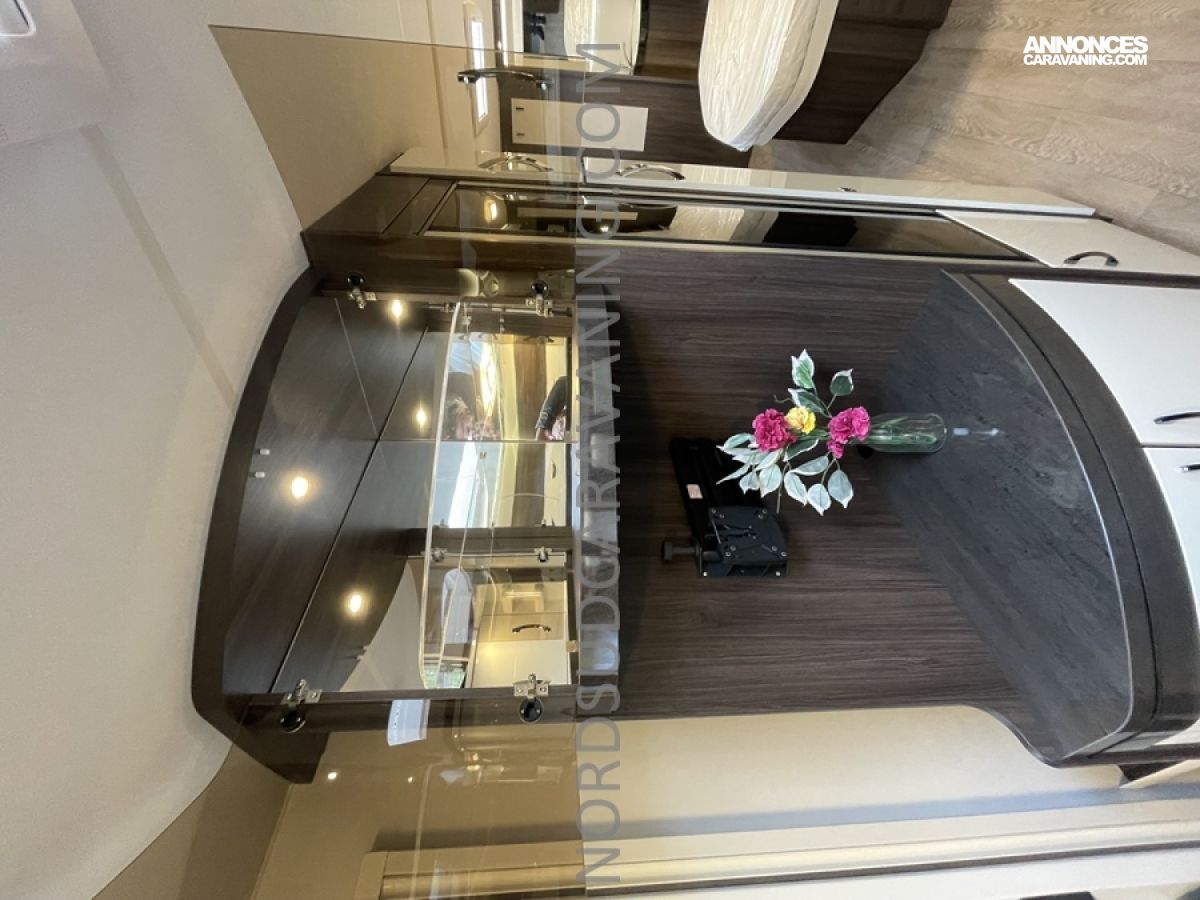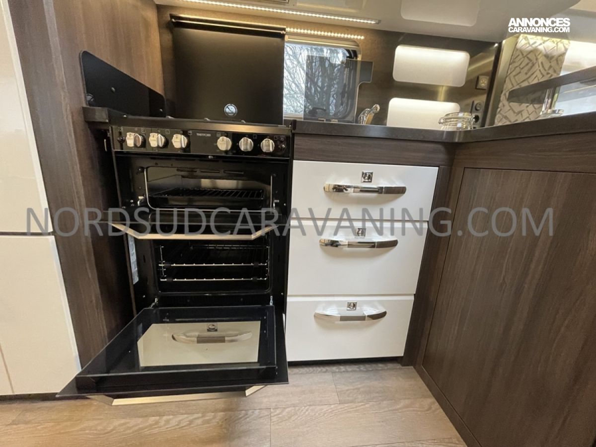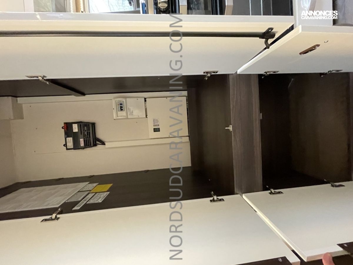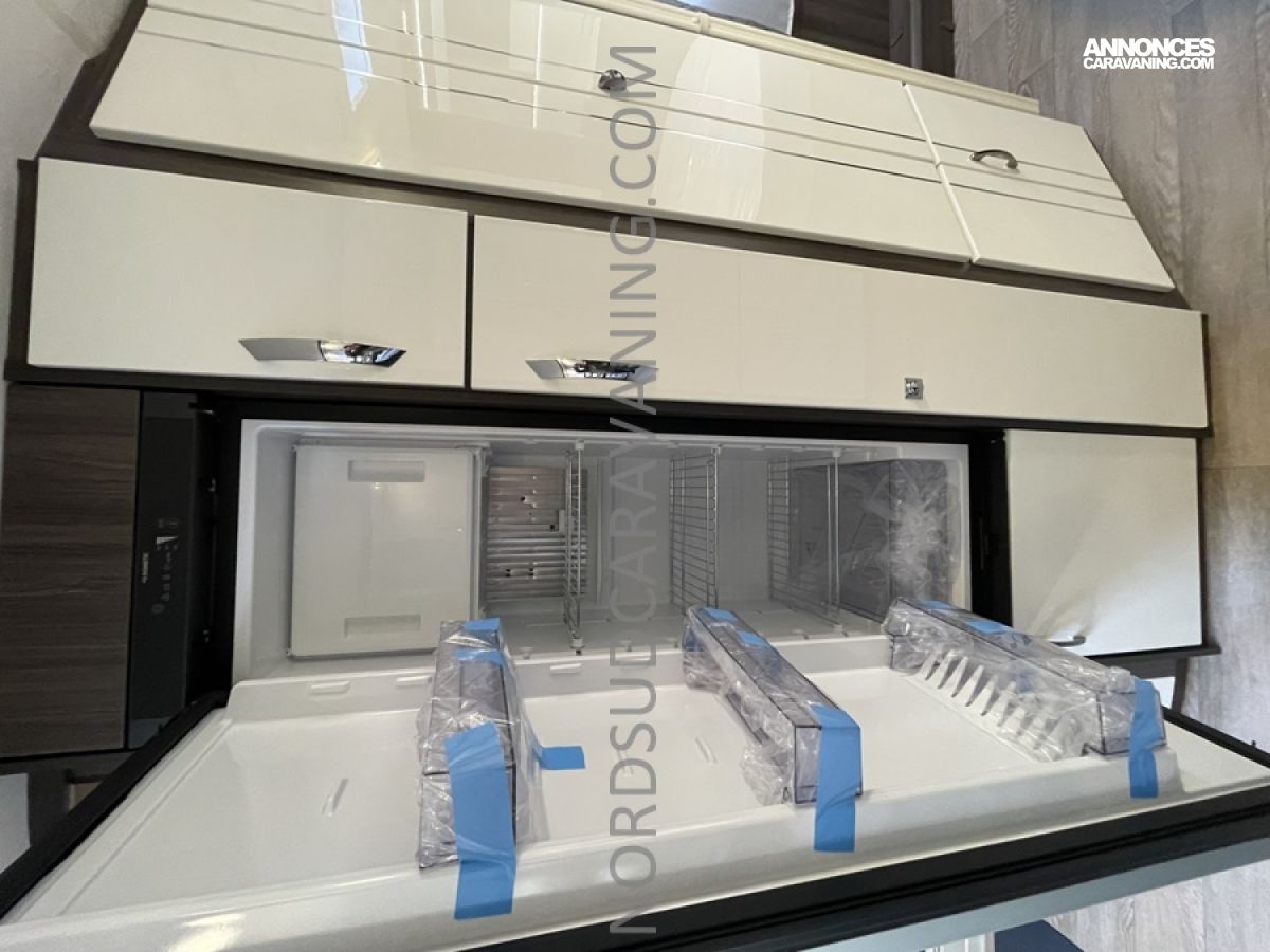 Pratique avec ses nombreux rangements, elle est très fonctionnelle avec sa cuisine équipée composée d’un réchaud 3 feux et évier inox protégés par un couvercle en verre et d’un réfrigérateur à absorption 133L.