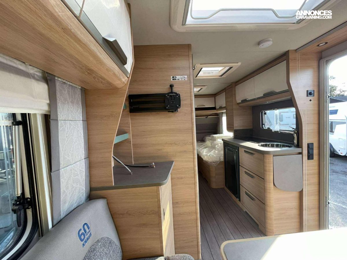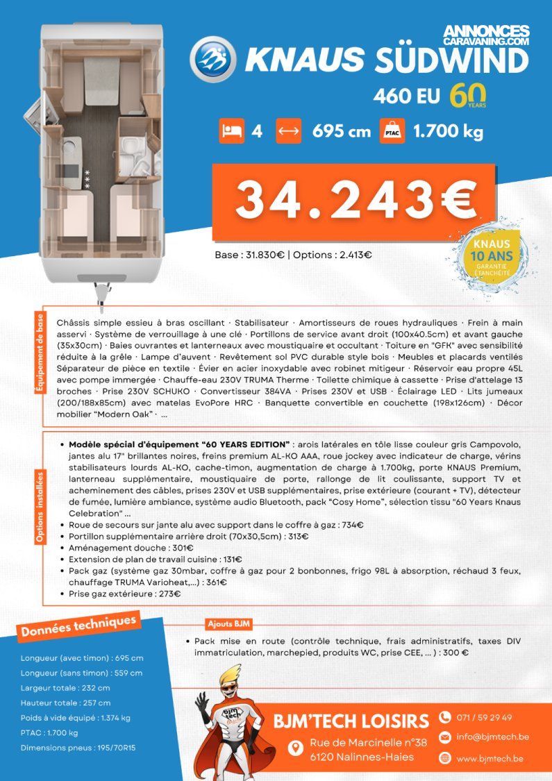 - Modèle spécial d’équipement “60 YEARS EDITION” : parois latérales en tôle lisse couleur gris Campovolo, jantes alu 17" brillantes noires, freins premium AL-KO AAA, roue jockey avec indicateur de charge, vérins stabilisateurs lourds AL-KO, cache-timon, augmentation de charge à 1.700kg, porte KNAUS Premium, lanterneau supplémentaire, moustiquaire de porte, rallonge de lit coulissante, support TV et acheminement des câbles, prises 230V et USB supplémentaires, prise extérieure (courant + TV), détecteur de fumée, lumière ambiance, système audio Bluetooth, pack “Cosy Home”, sélection tissu "60 Years Knaus Celebration" ...