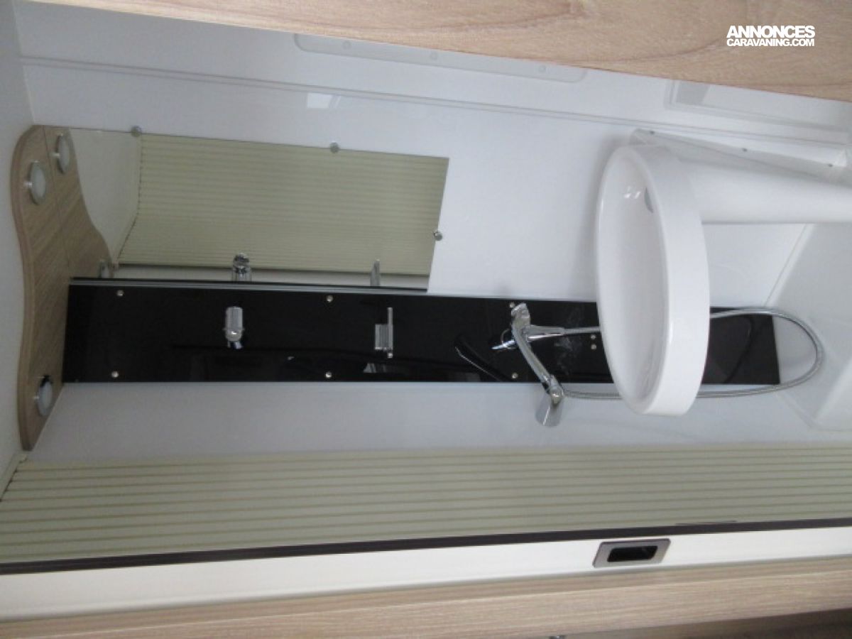 Combiné douche avec lavabo pivotant, Dimensions lit permanent : 140 x 190 cm, Dimensions dinette / couchage : 150 x 190 cm, Sommier à lattes avec ouverture par vérins, Pompe à eau Shurflo 7 L, Réservoir d'eau propre 45 L, Réservoir eaux usées amovible 30 L, Chauffe-eau Truma Therme 5 L + mitigeur