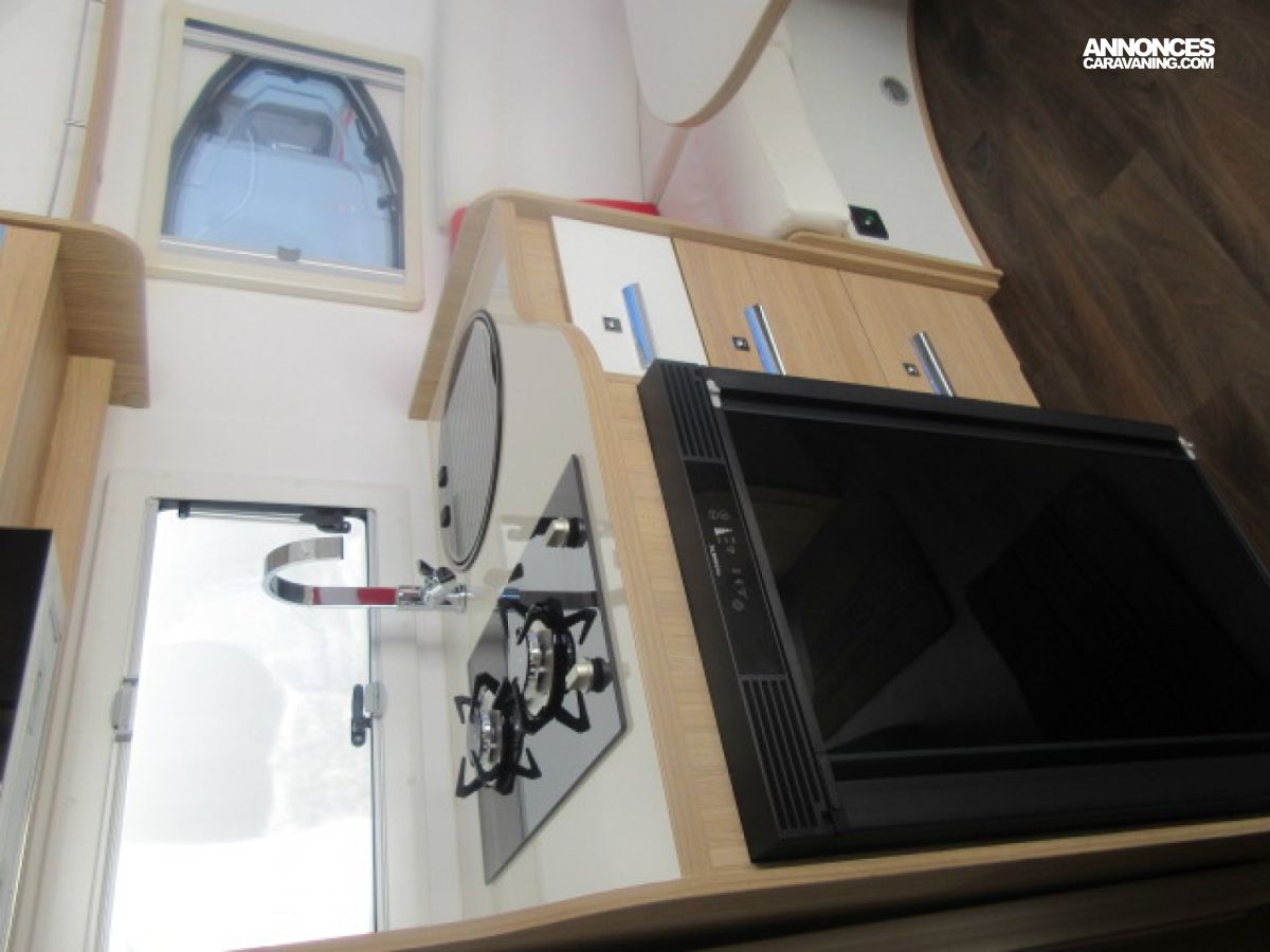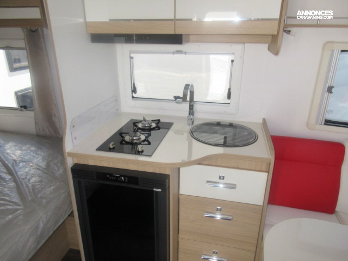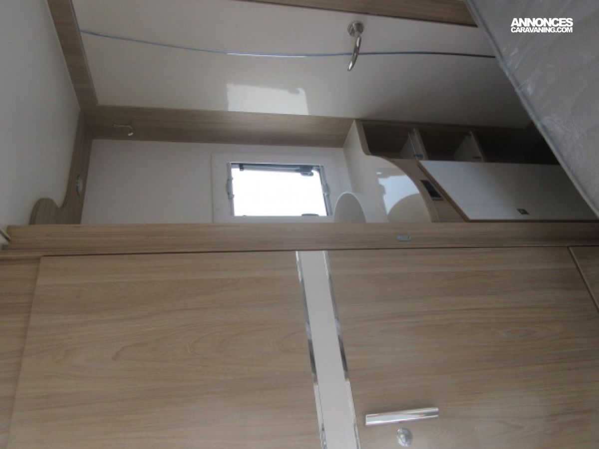 Amortisseurs ALKO, Anti-lacets AKS 3004, Vérins renforcés ALKO, Cache flèche, Roues jante aluminium, Toit anti-grele polyester, Plancher polyester, Table de cuisson 2 feux et cuve inox, Hotte aspirante, Réfrigérateur à compression 83 L, WC à cassette pivotant électrique, Douche indépendante, Dimensions lit permanent : 140 x 200 cm, Dimensions dinette : 150 x 214 cm, Sommier à lattes avec ouverture par vérins, Réservoir d'eaux propres 45 L, Réservoir d'eaux usées amovibles 30 L, Chauffe-eau Truma Therme 5 L + mitigeur