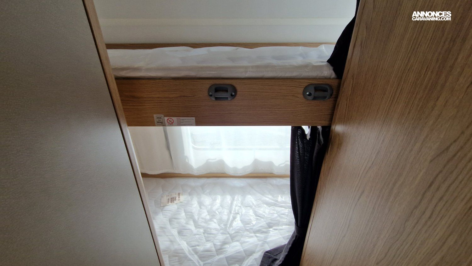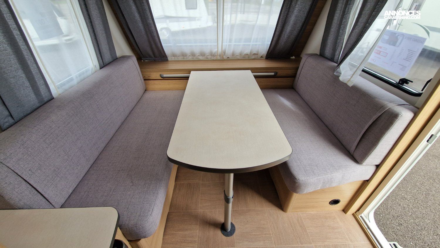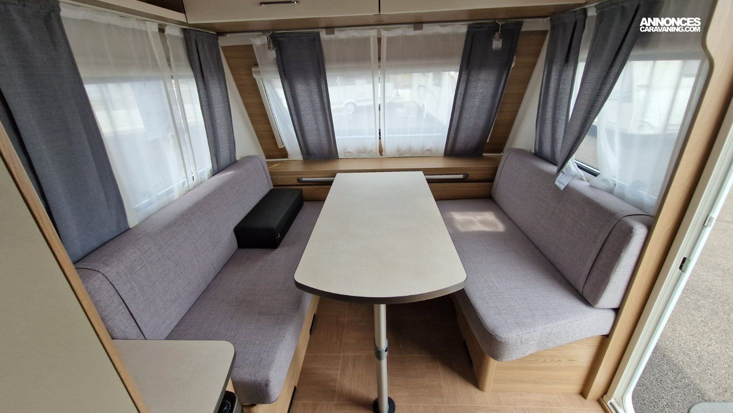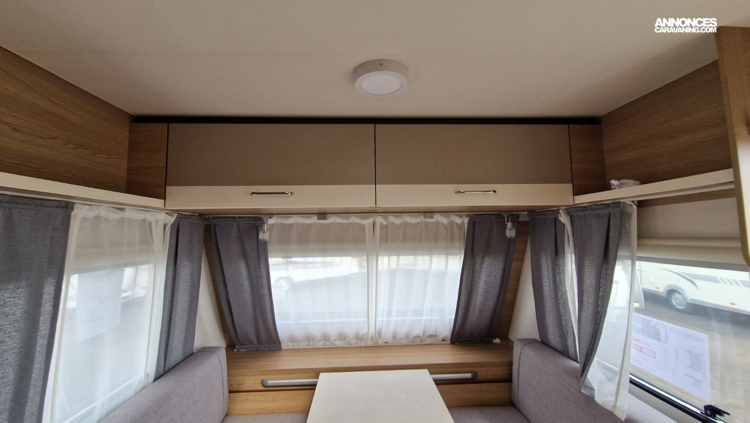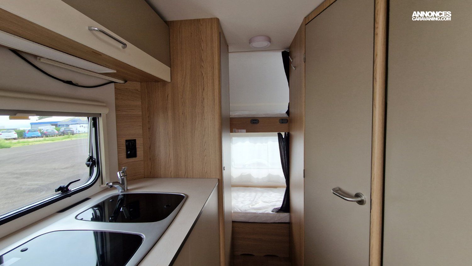 Avec ses cinq implantations compactes, la Sassino 390 TK offre jusqu’à sept couchages en lit simple, double ou superposé. L’intérieur affiche des teintes chaudes et apaisantes avec un décor bois « Maryland Oak », créant une ambiance conviviale et agréable.