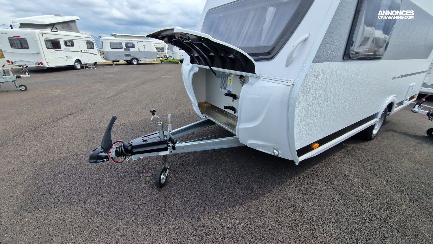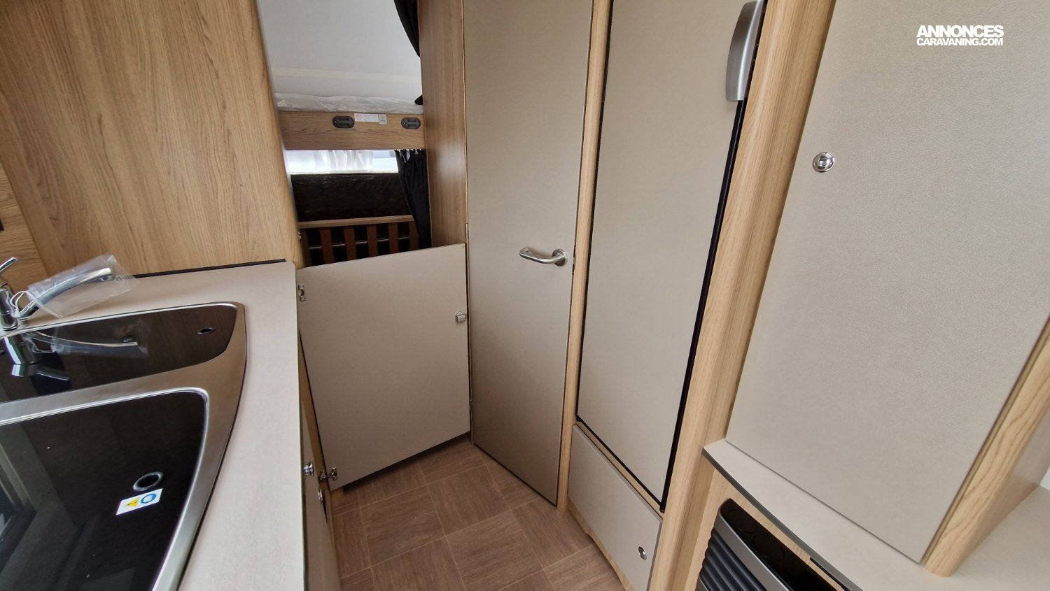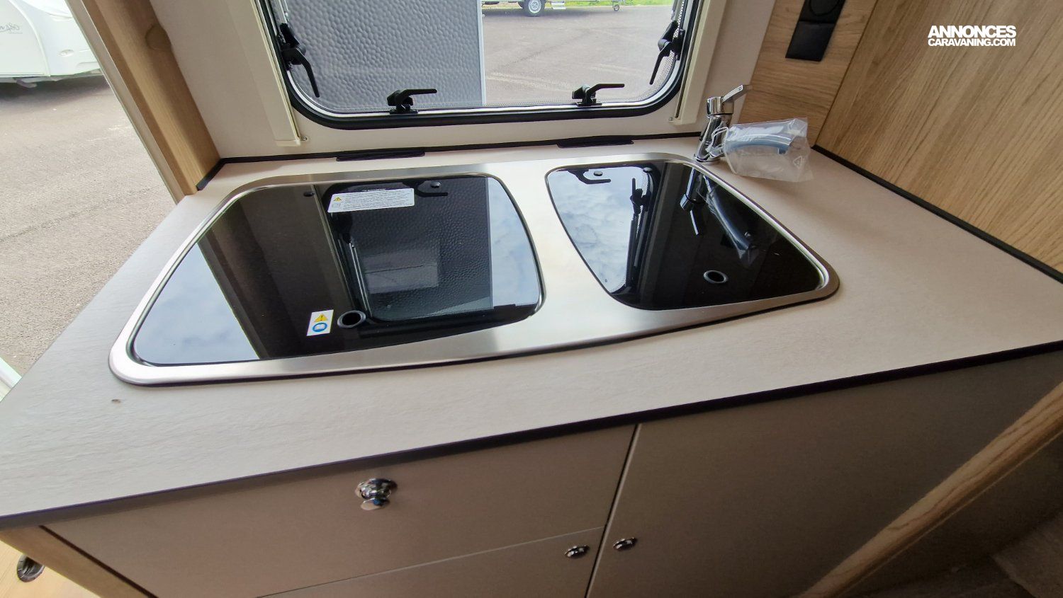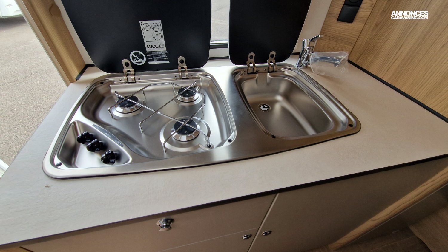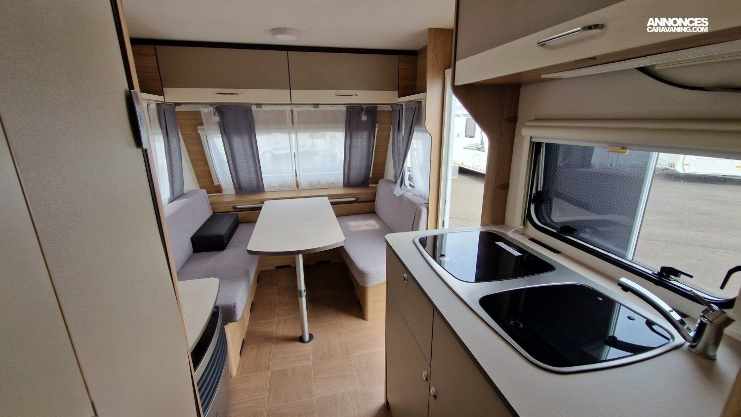 Avec ses cinq implantations compactes, la Sassino 390 TK offre jusqu’à sept couchages en lit simple, double ou superposé. L’intérieur affiche des teintes chaudes et apaisantes avec un décor bois « Maryland Oak », créant une ambiance conviviale et agréable.