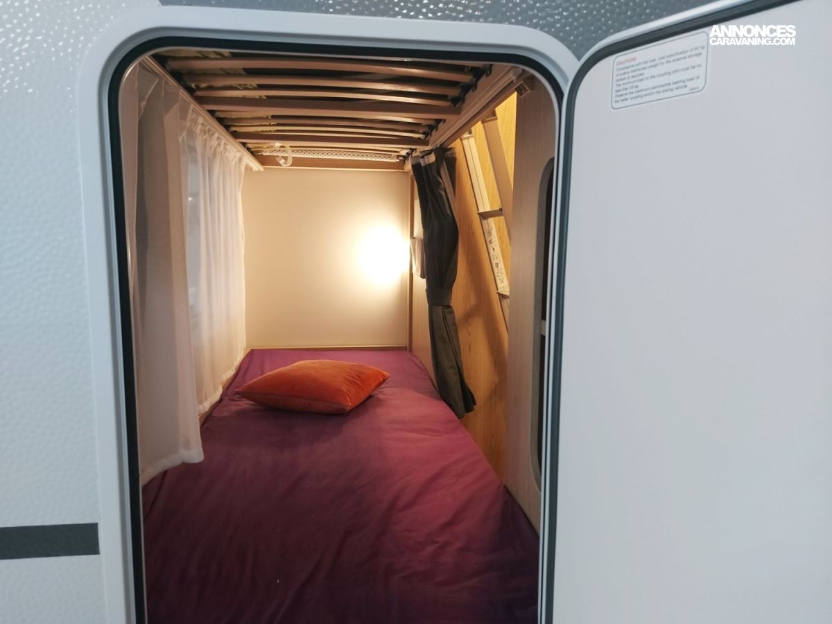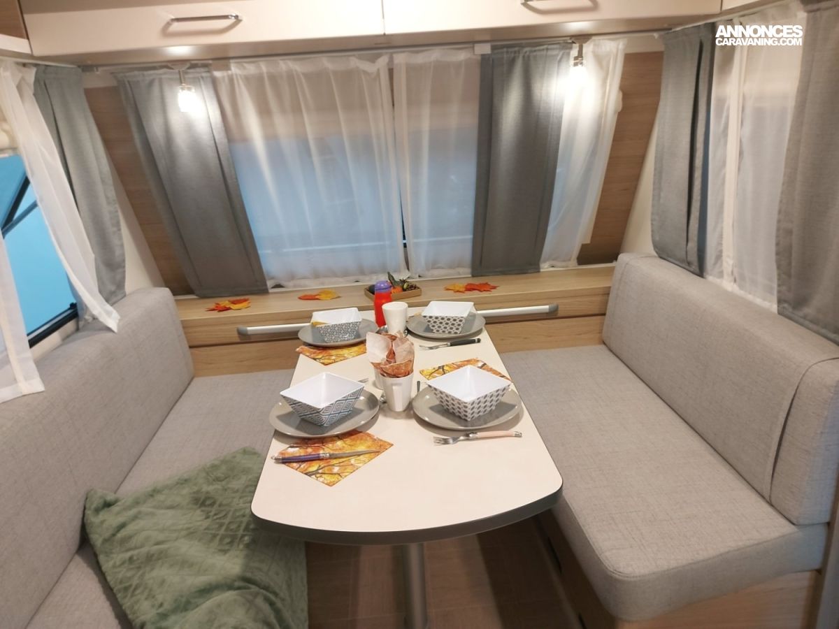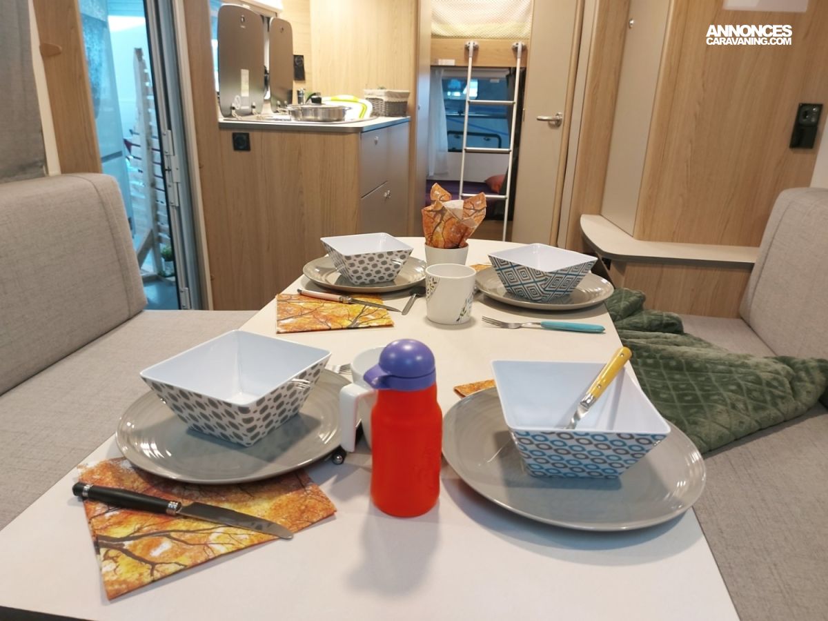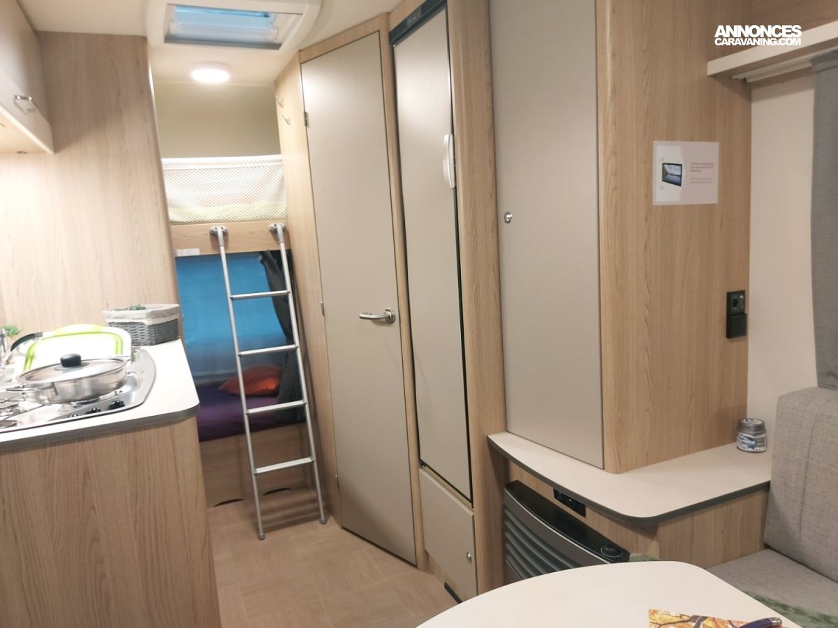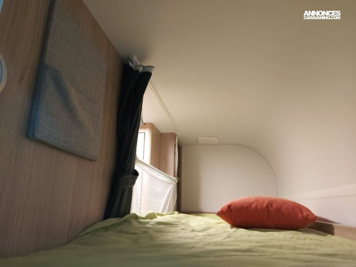 Caravane familiale de petite dimension, offrant un grand confort et un excellent niveau d'équipements : 2 lits superposés de belles dimensions susceptibles de supporter un poids de 80 kg, dînette confortable, de nombreux rangements, grand réfrigérateur à compression, chauffage, eau chaude, équipement douche et auvent classique TRIGANO.