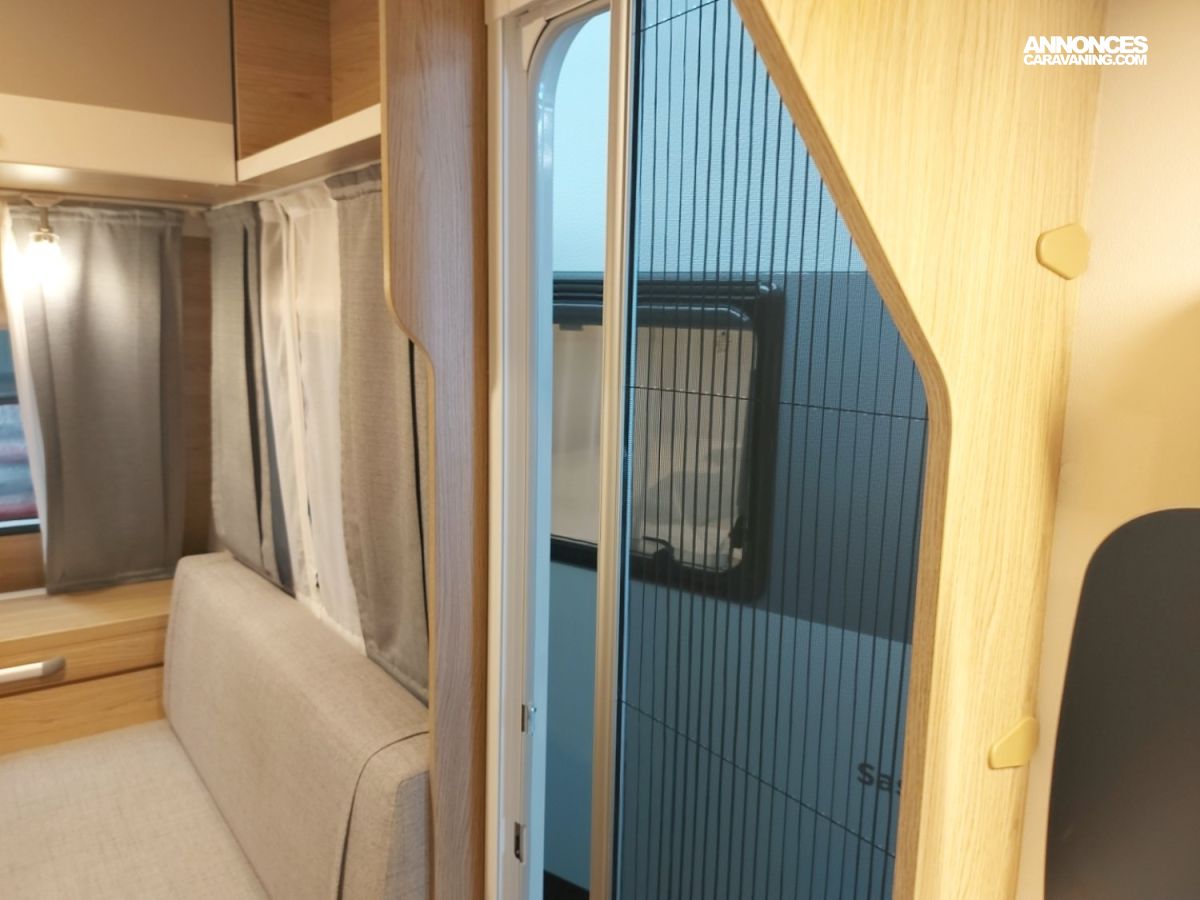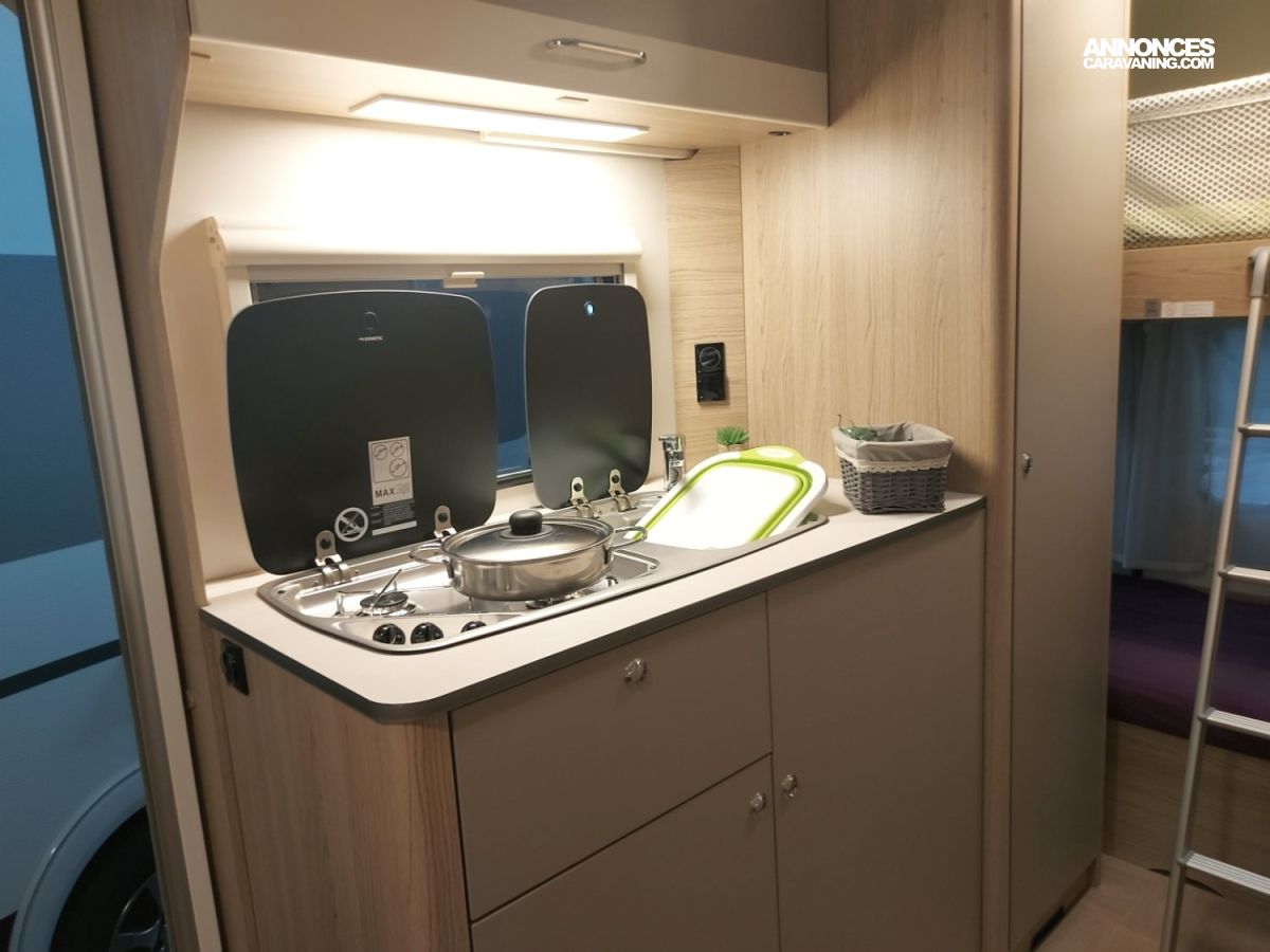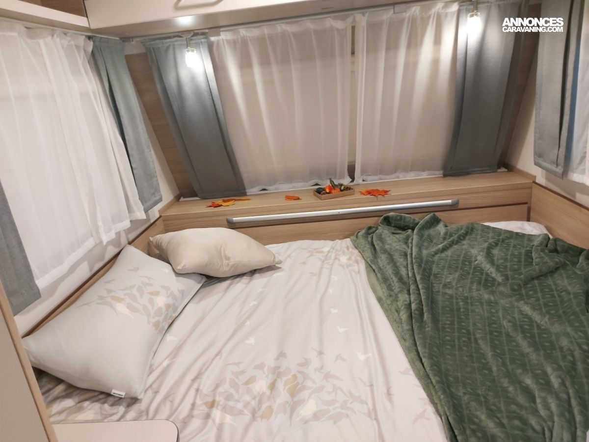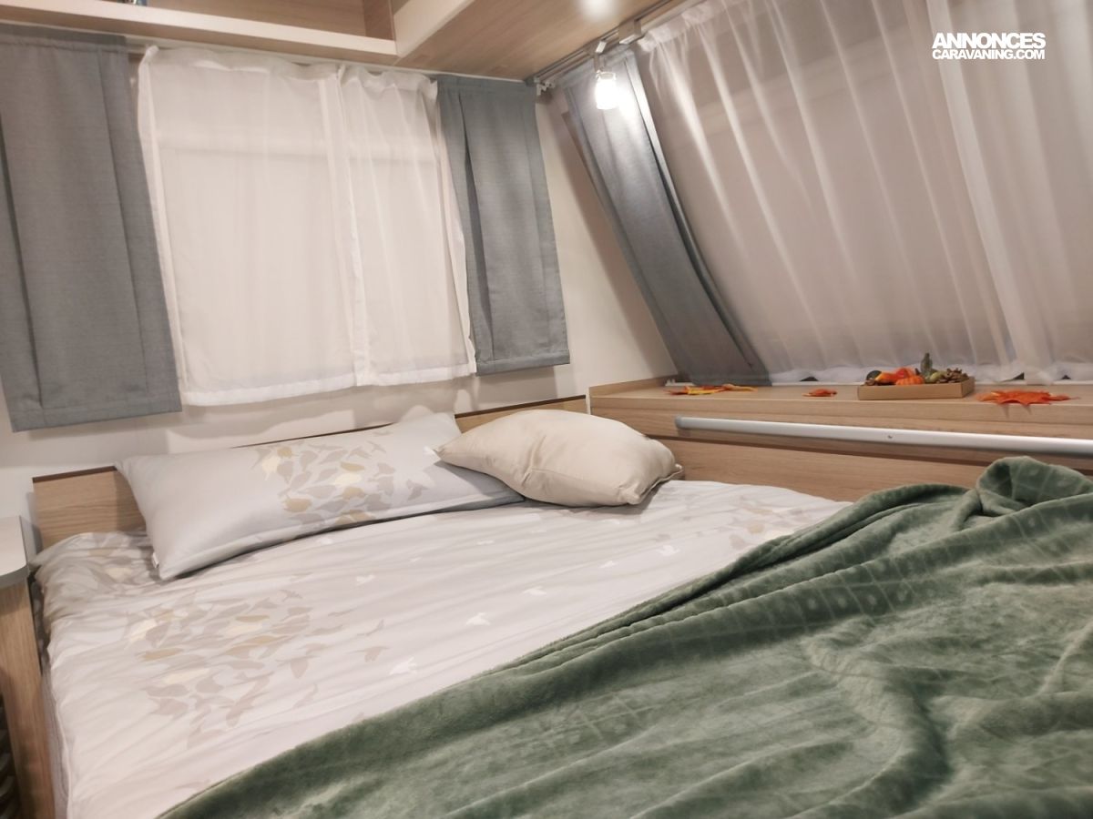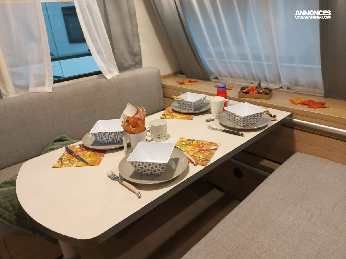 Caravane familiale de petite dimension, offrant un grand confort et un excellent niveau d'équipements : 2 lits superposés de belles dimensions susceptibles de supporter un poids de 80 kg, dînette confortable, de nombreux rangements, grand réfrigérateur à compression, chauffage, eau chaude, équipement douche et auvent classique TRIGANO.