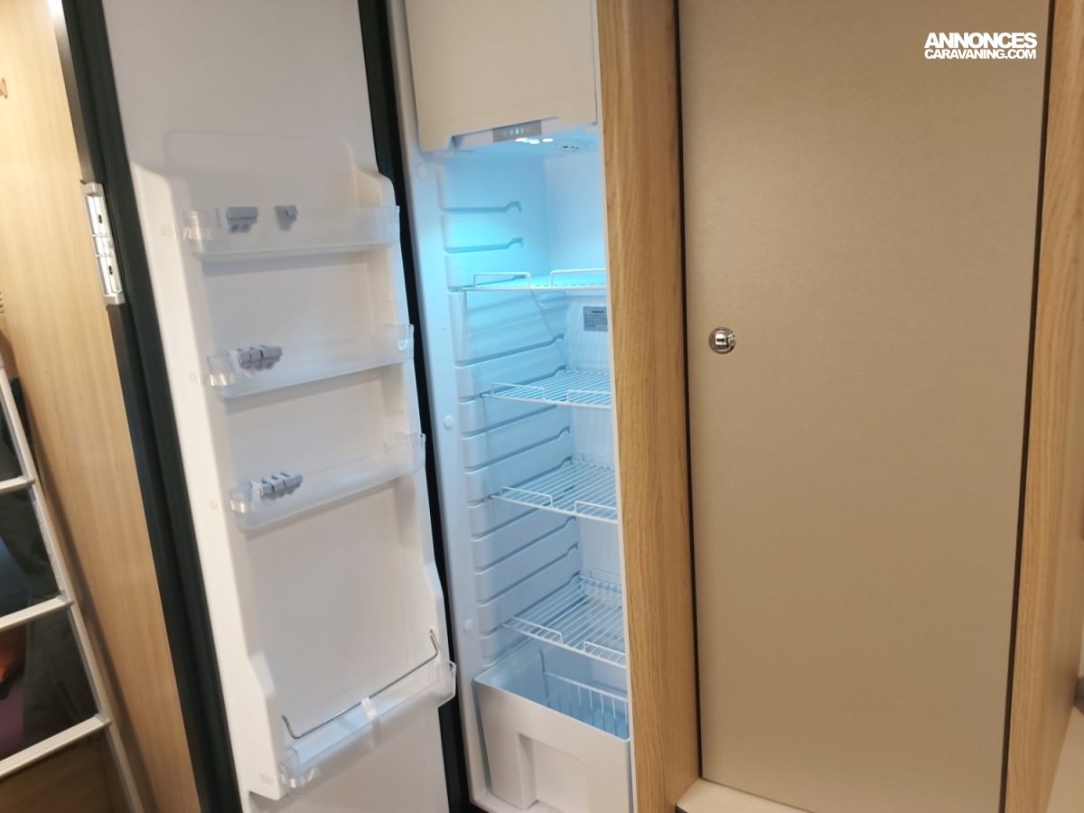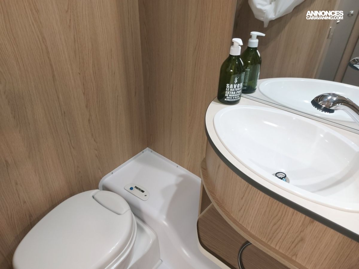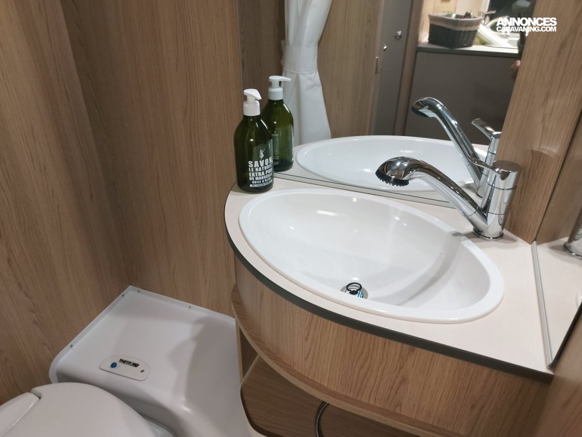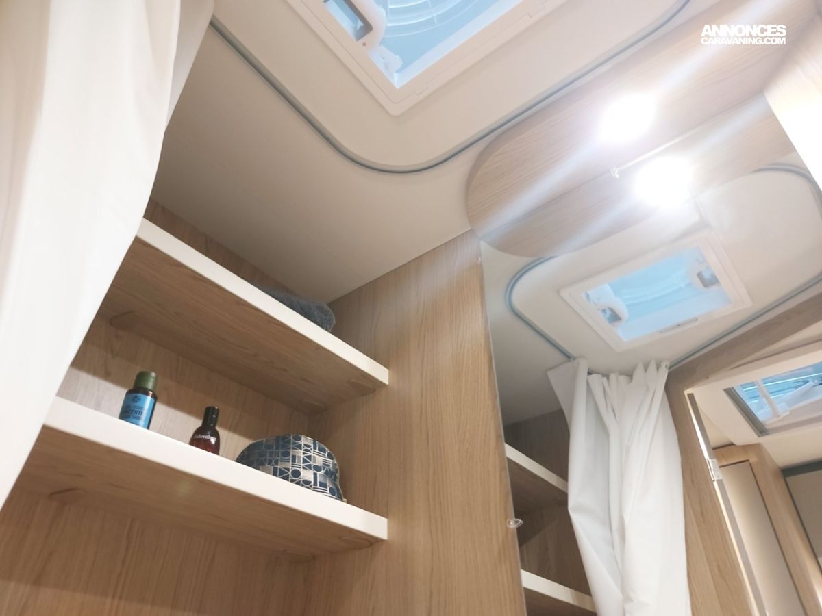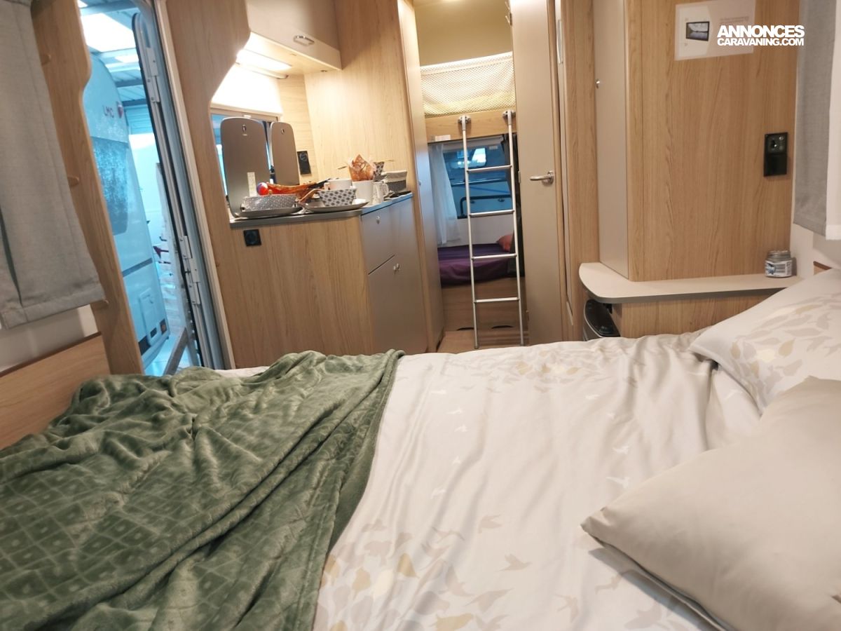 Caravane familiale de petite dimension, offrant un grand confort et un excellent niveau d'équipements : 2 lits superposés de belles dimensions susceptibles de supporter un poids de 80 kg, dînette confortable, de nombreux rangements, grand réfrigérateur à compression, chauffage, eau chaude, équipement douche et auvent classique TRIGANO.