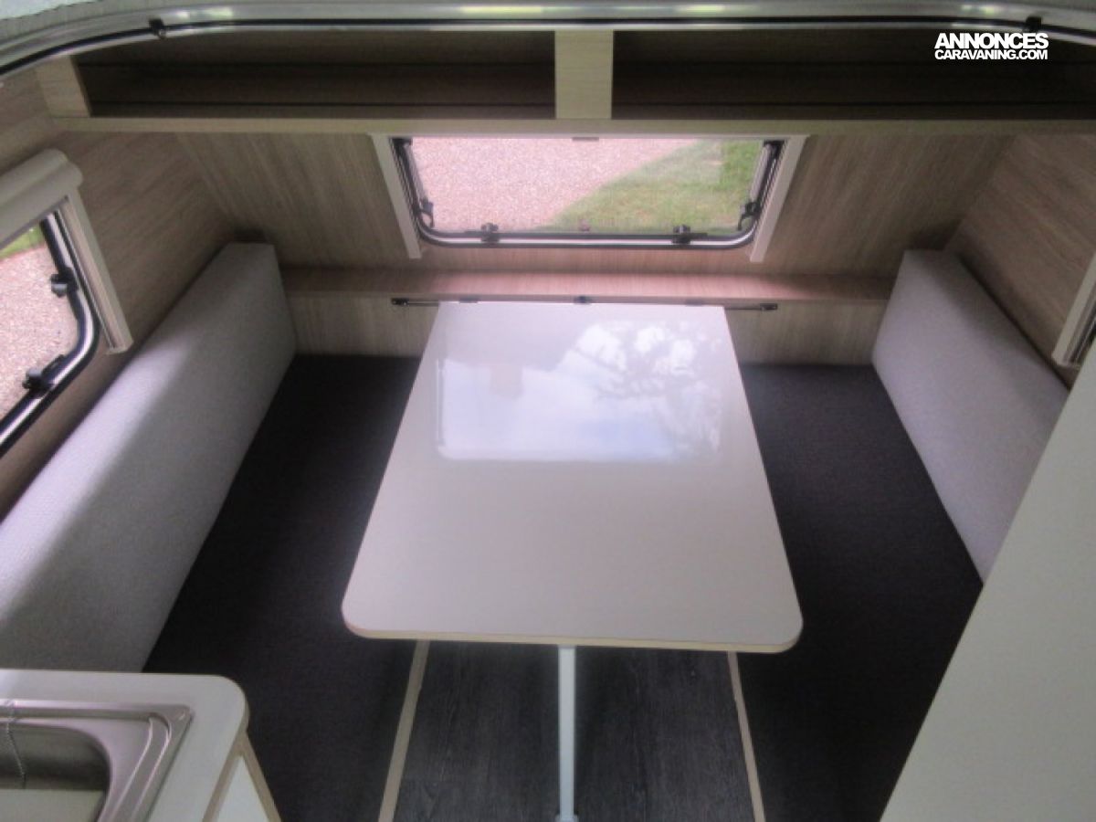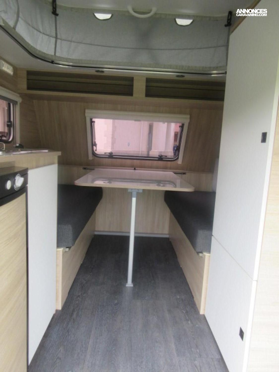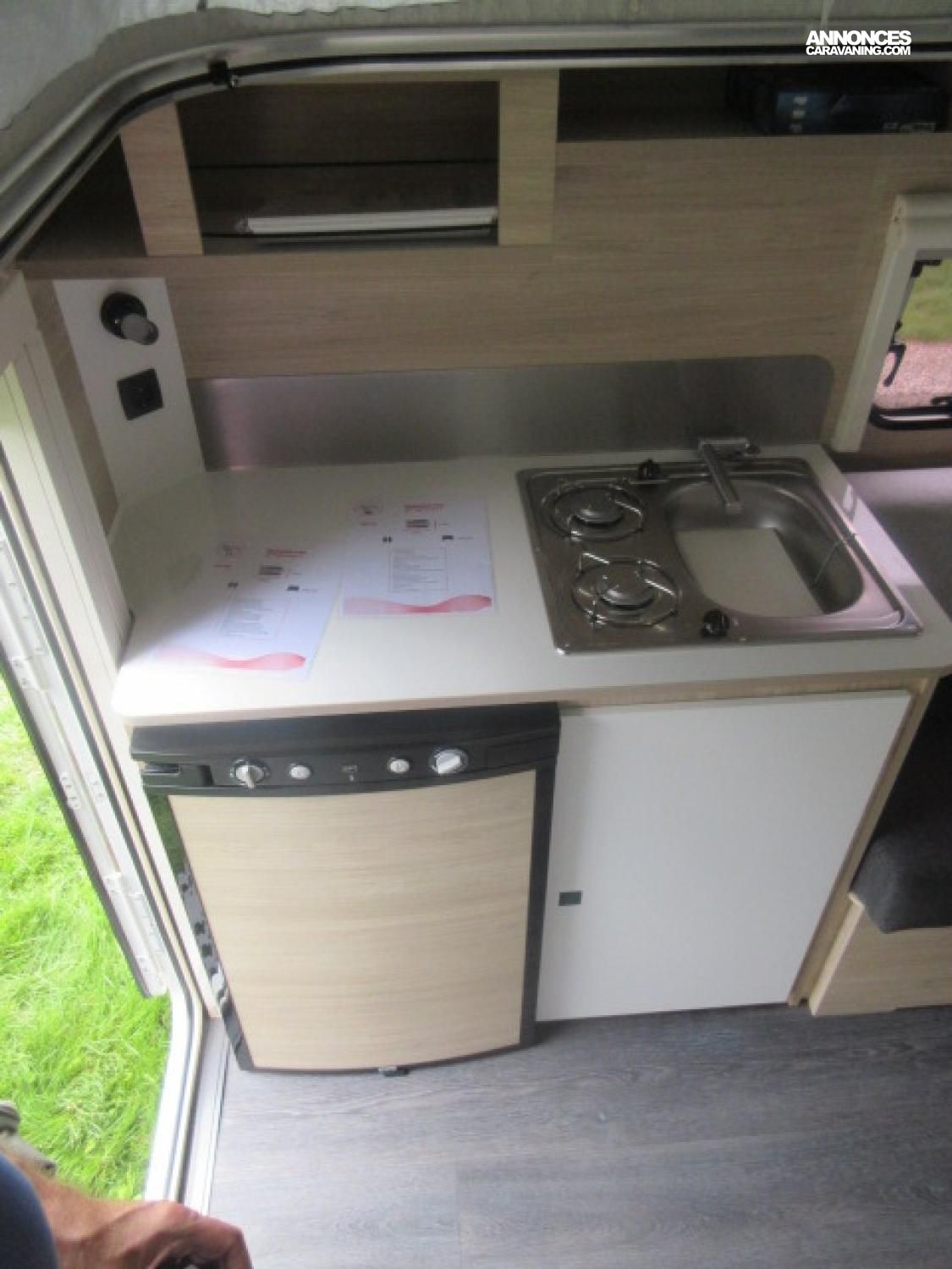 Jerrican d'eaux propre 20 L, Prises 230 V, Réfrigérateur tri-mixte 85 L, Réchaud 2 feux combi évier, Porte d'entrée XL, Toit polyester, Baies ouvrantes double vitrage, Baie avant, Compartiment bouteille à gaz, Store combi occultant + moustiquaire, Spots de lecture LED prise USB, Dinette avant transformable en couchage 2 personnes : 190 x 140 cm