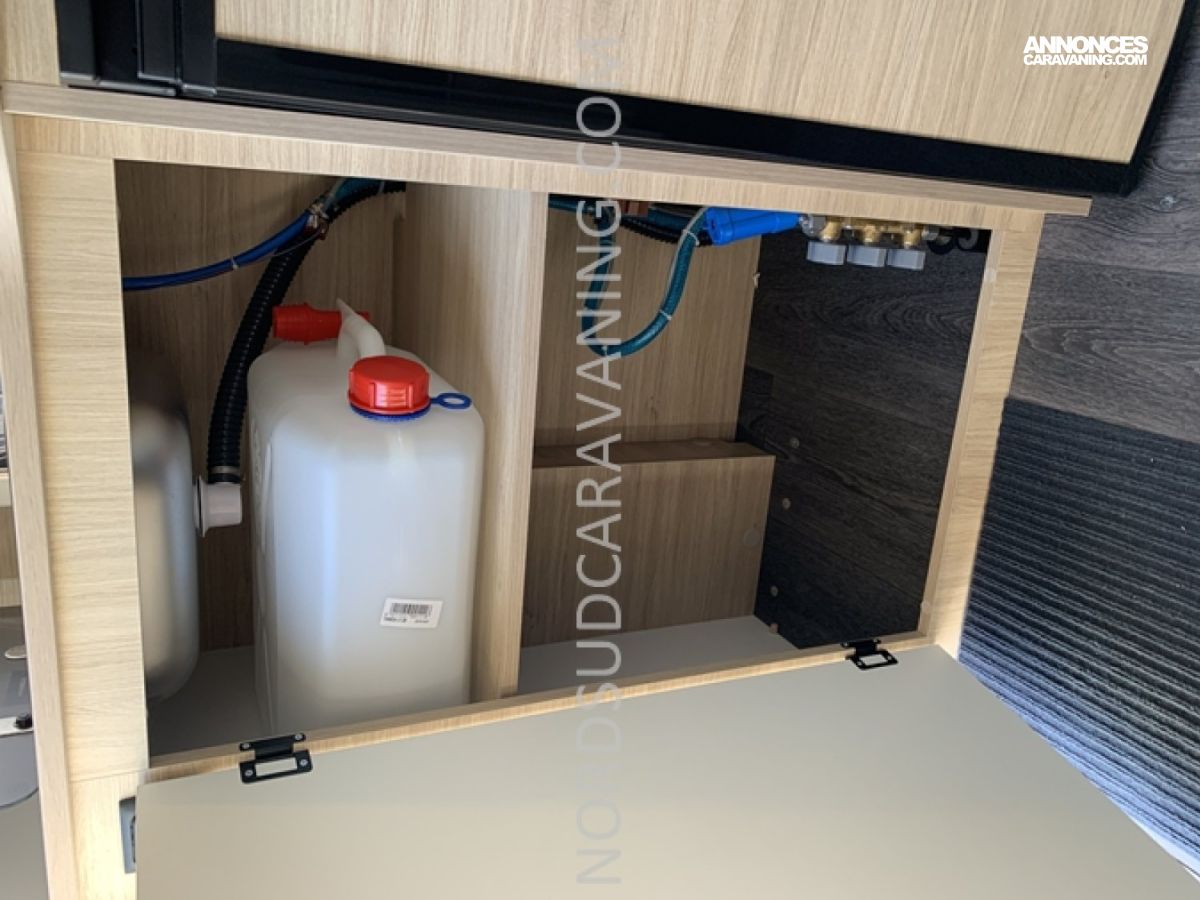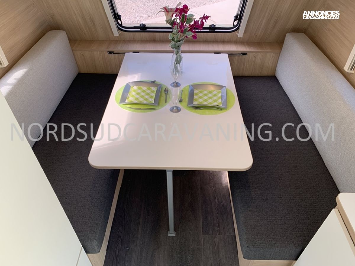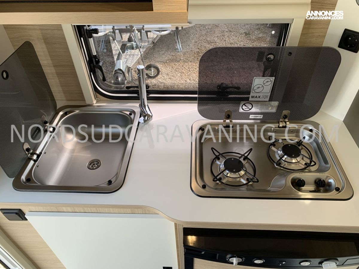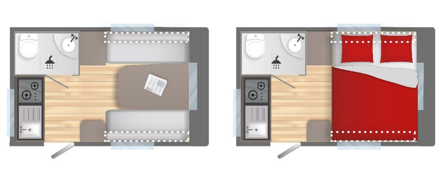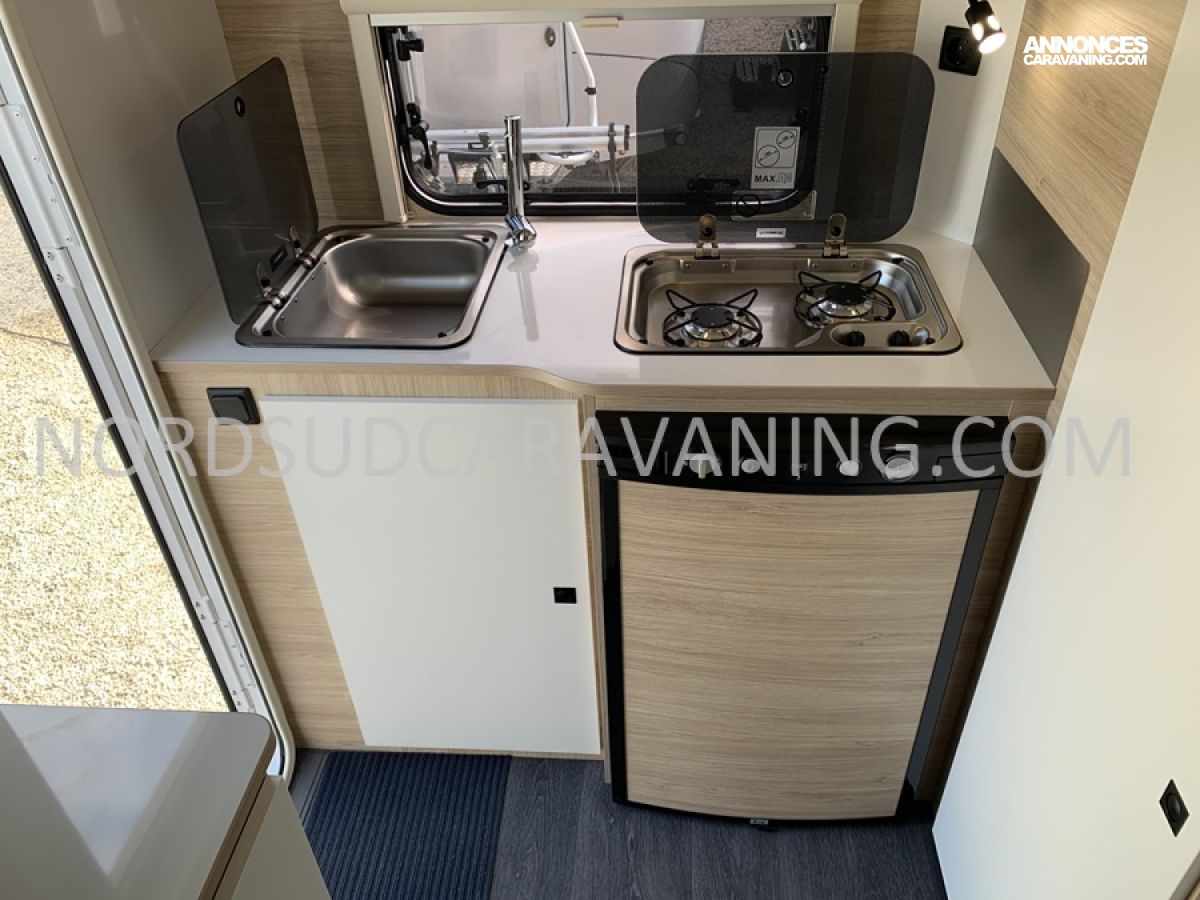 Elle possède une dînette transformable en un grand couchage 2 personnes, une cuisine équipée avec évier cuve inox, plaque 2 feux gaz et réfrigérateur (85L), un coin toilette avec lavabo, ainsi que de nombreux rangements ! Autrement dit, une caravane toute équipée dans des dimensions ultra compacte sans négliger le confort !