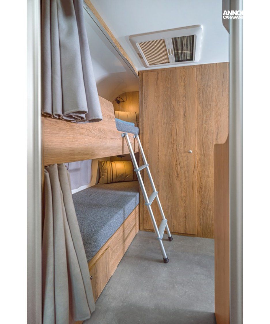 NIEWIADO LAZUR : l'espace de vie comprend une table qui se transforme facilement en un confortable lit double. A l'arrière de la caravane, des lits superposés offrent une solution confortable pour les enfants. La caravane est équipée d'une salle de bain avec WC, douche, chauffe eau. Tout le nécessaire pour voyager et vivre confortablement au quotidien