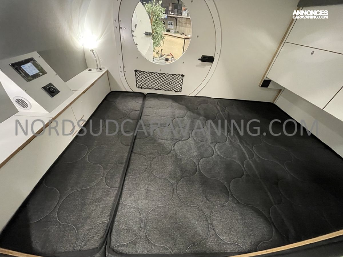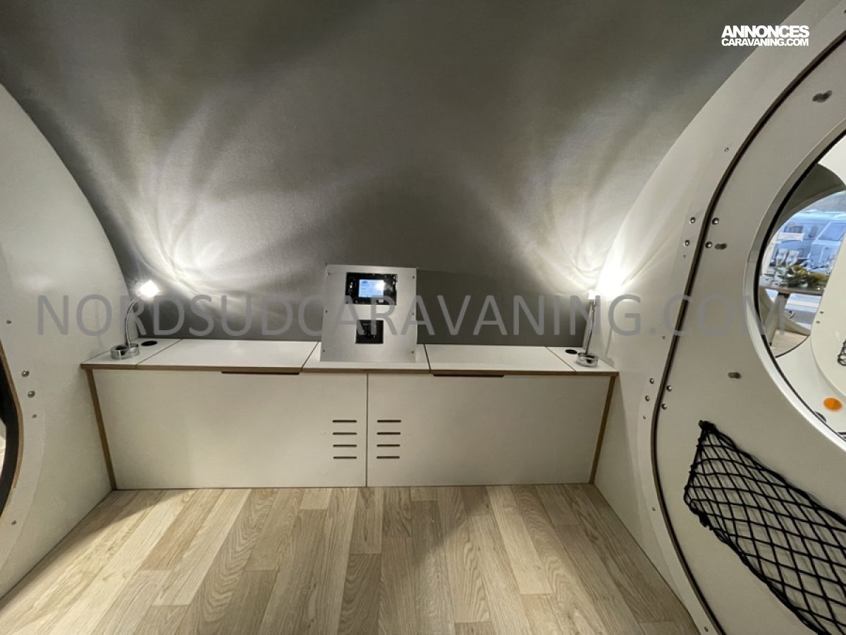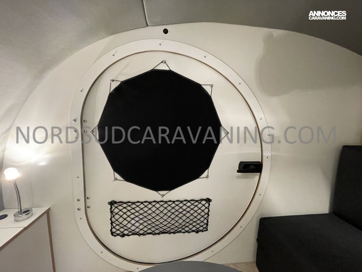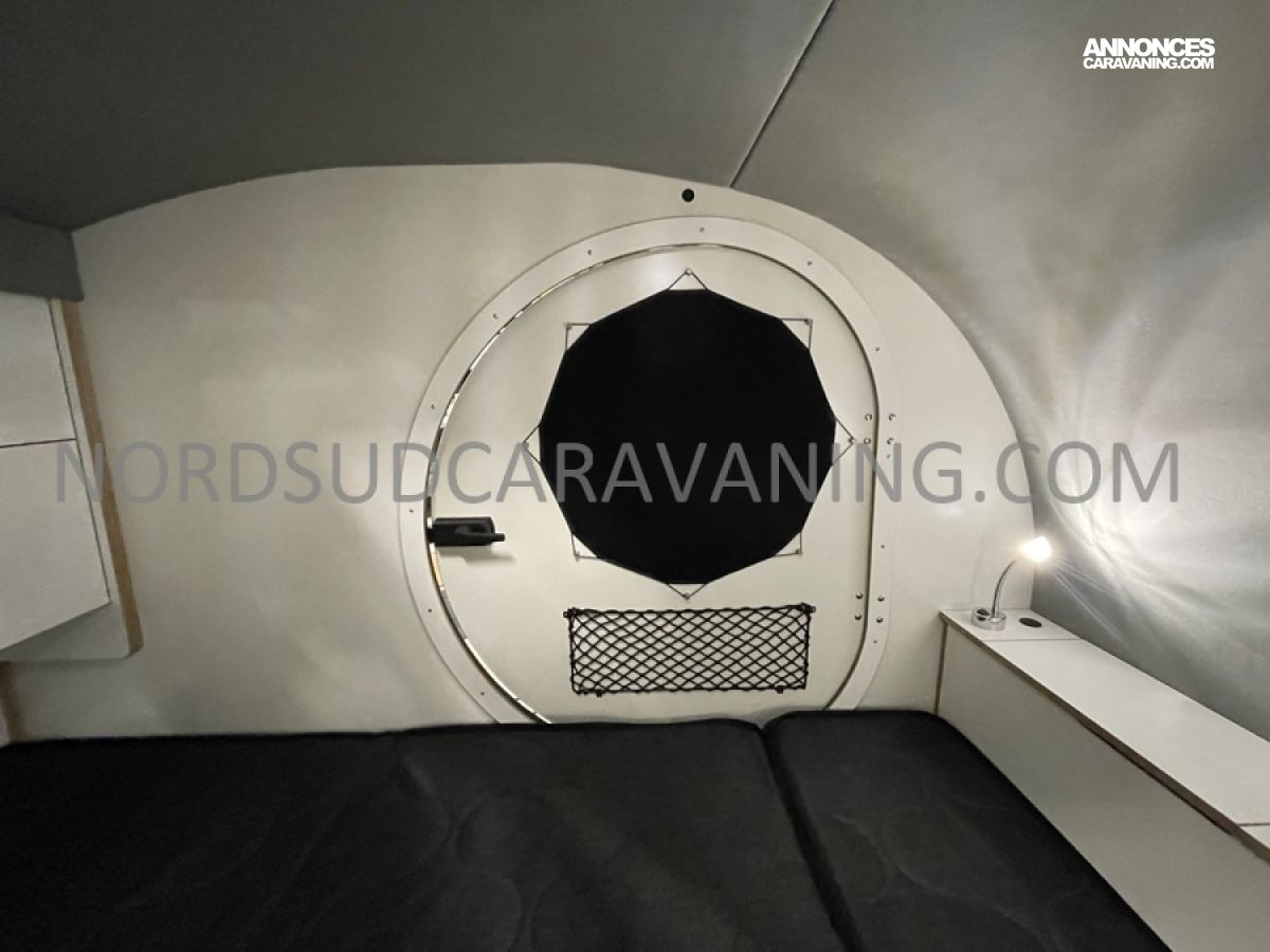 Conçue pour être légère et aérodynamique, elle offre un espace de couchage pour deux personnes et une petite cuisine extérieure accessible par une porte arrière.
