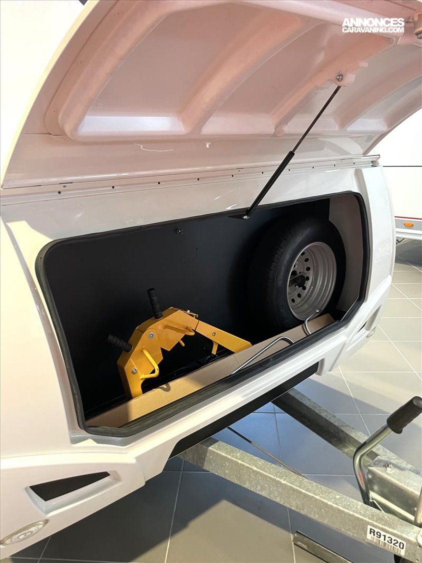 Bac à douche, Eclairage intérieur LED, Store combi occultant + moustiquaire, Transformateur 230/12V + disjoncteur, Vérins rallongés à l'avant, Réfrigérateur trimixte 85L, Combiné réchaud 3 feux, WC à cassette électrique, Barres porte vélo supérieure + inférieure, Eclaireur d'auvent, Enjoliveurs de roues