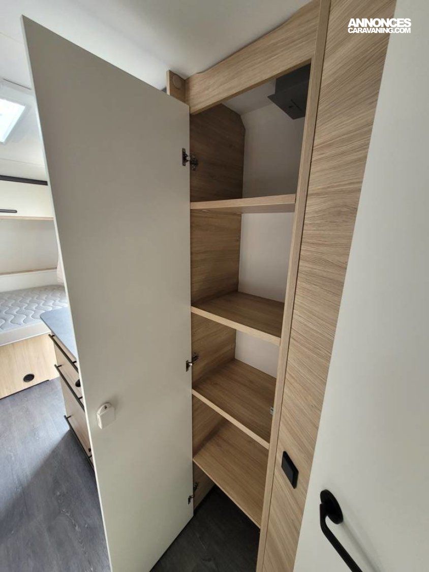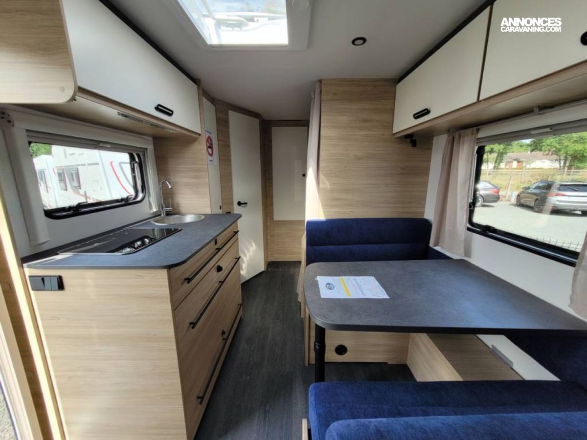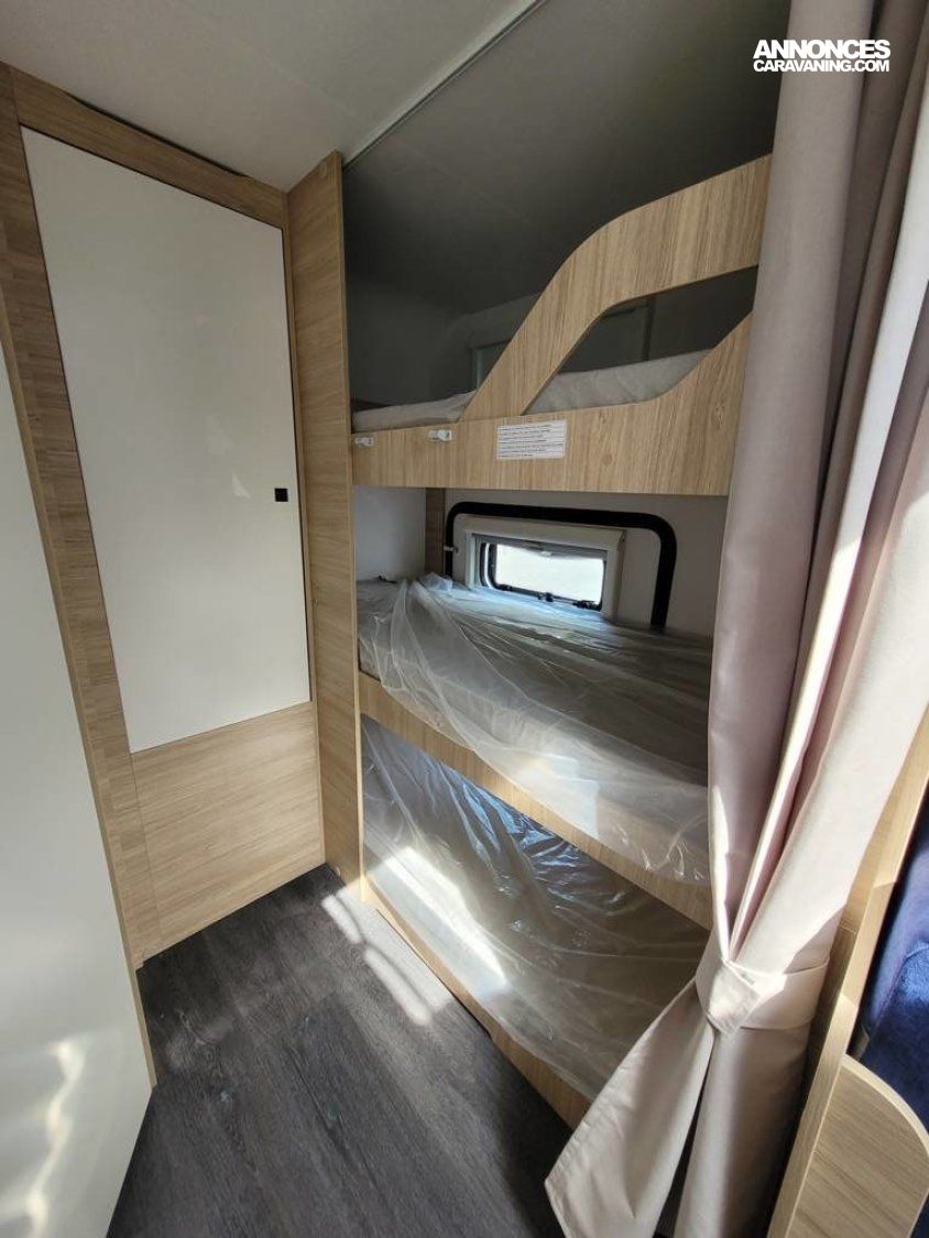 Bac de douche, Dînette milieu, Lit avant transversal, Lits superposés, WC cassette.