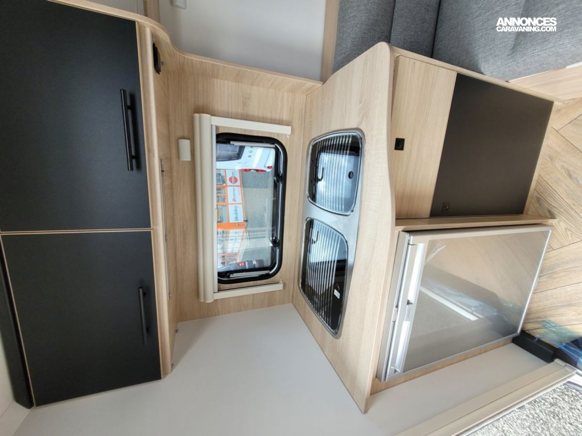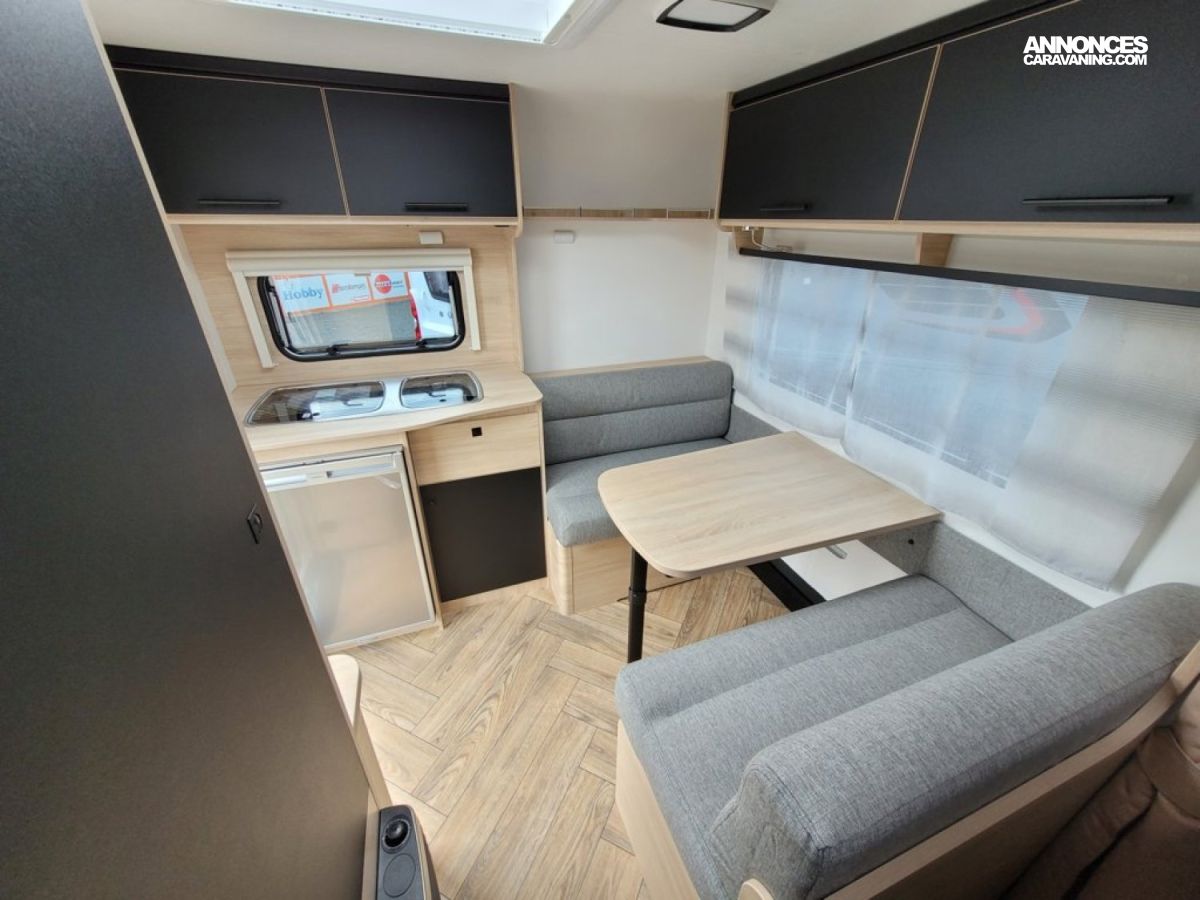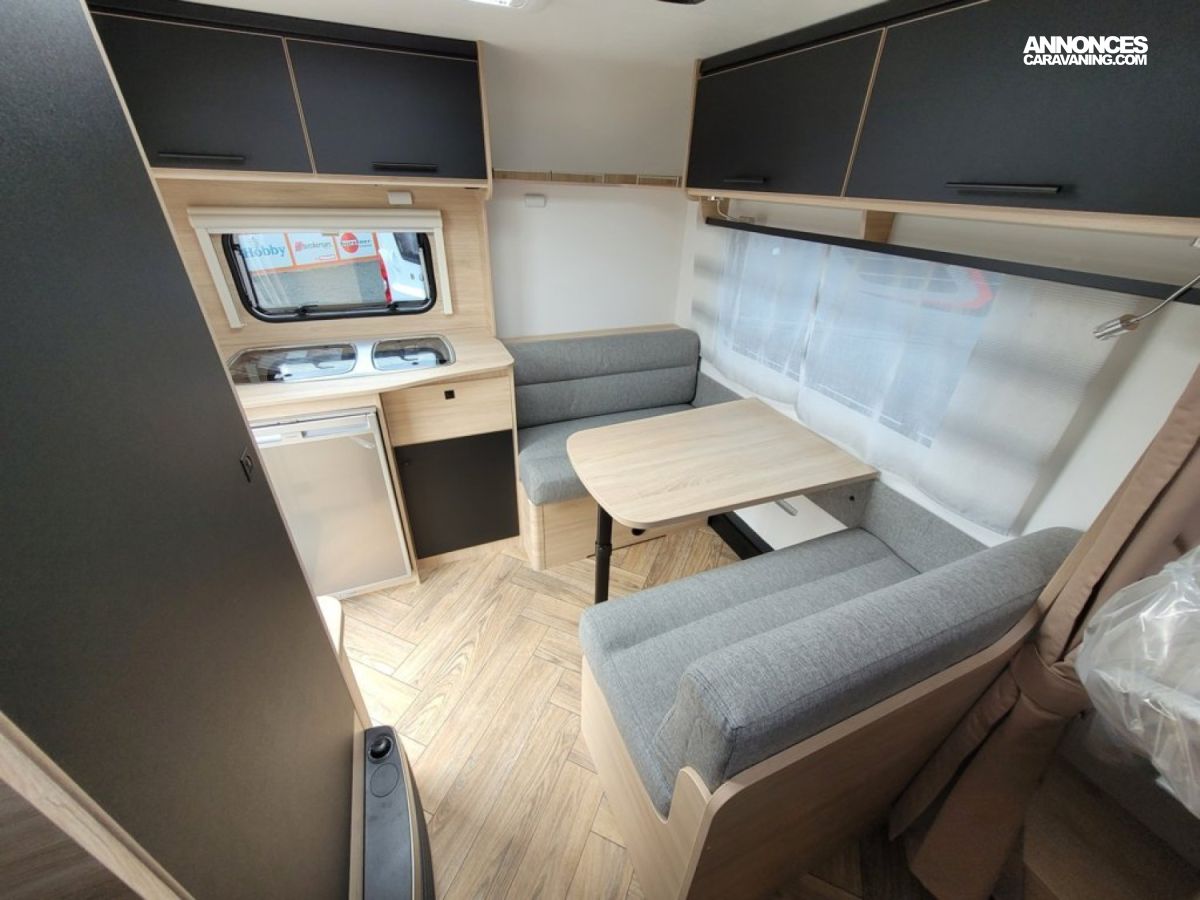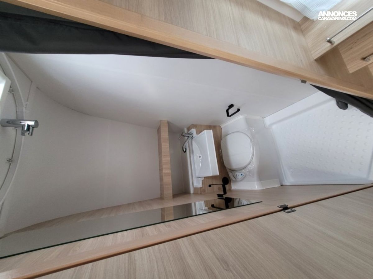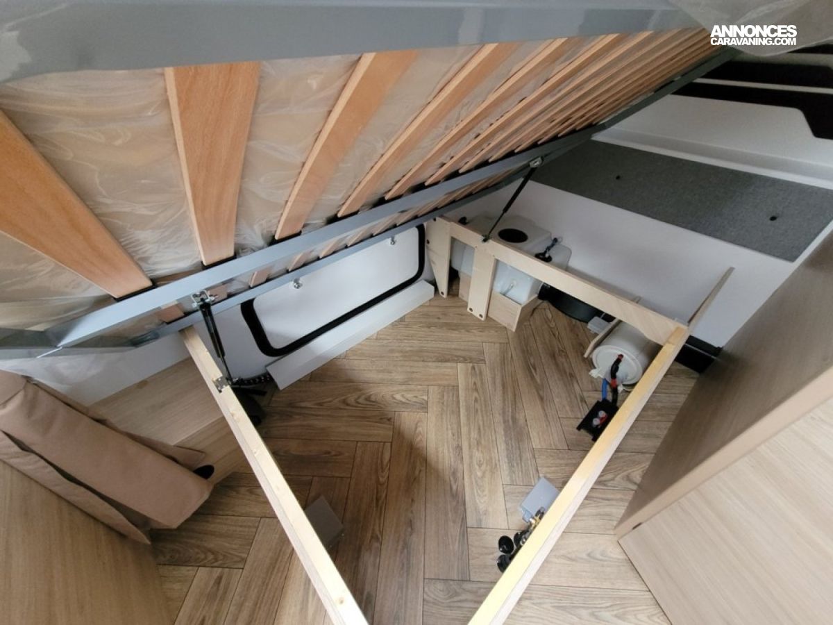 Bac de douche, Cuisine en bout, Dinette d'angle, Lit à la Française, WC chimique.
