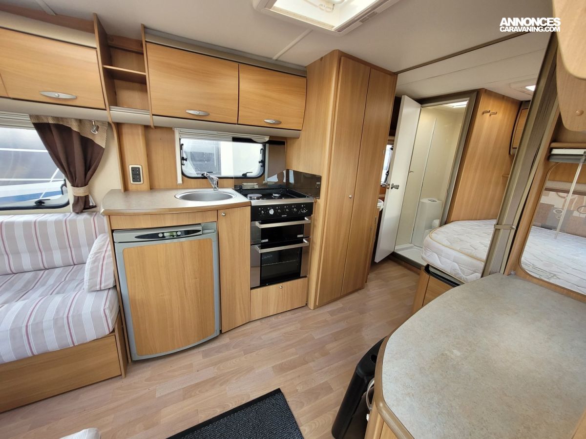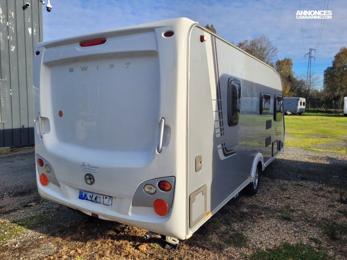 Caravane anglaise de la marque Swift. Implantation en lit à la française, avec moover, four, micro-onde, douche et radio.