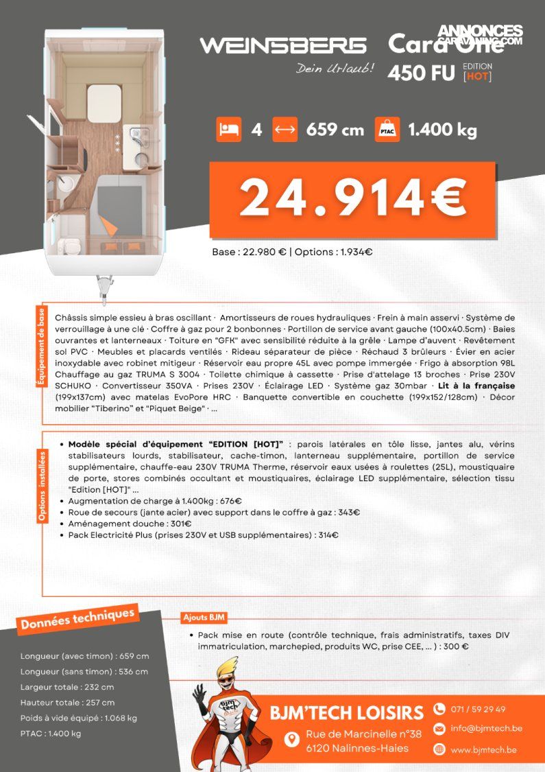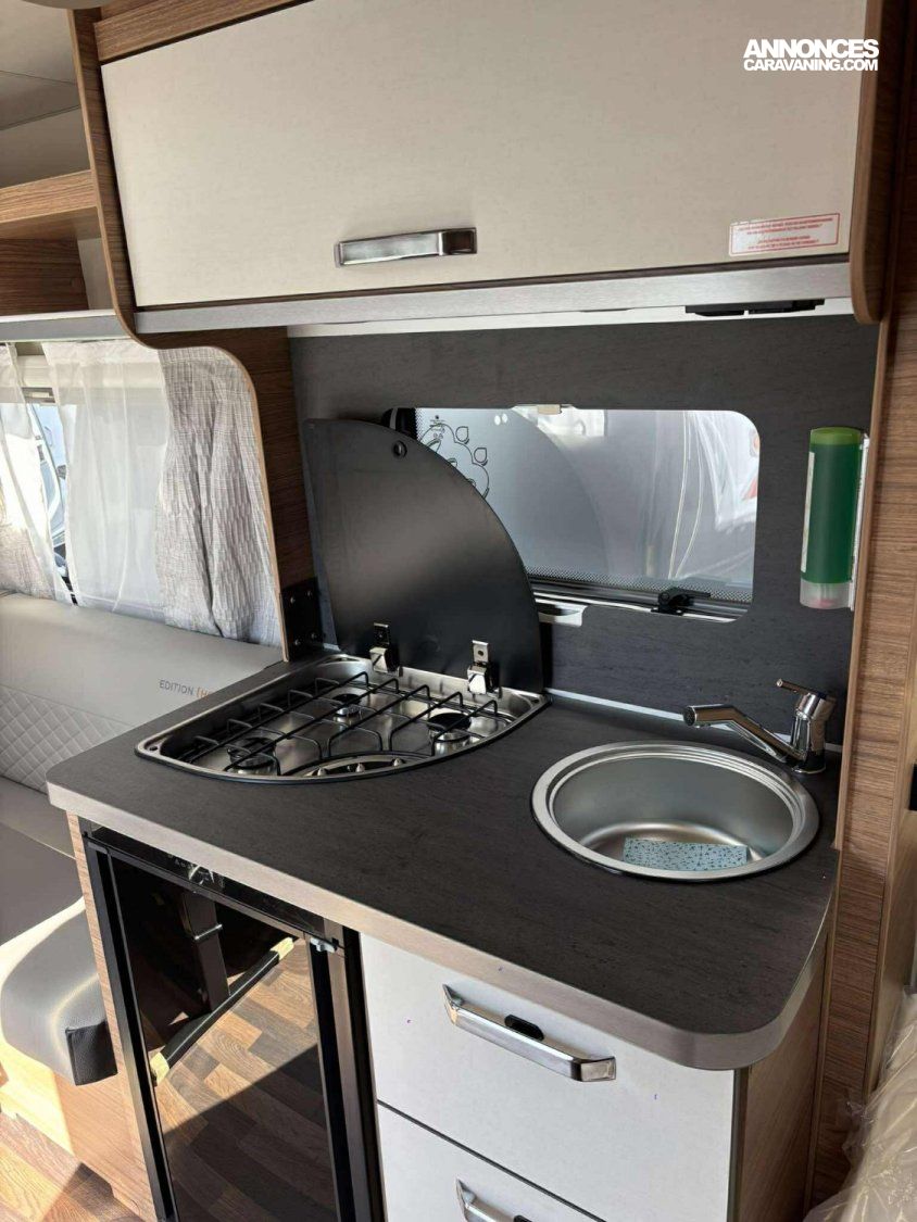 - Modèle spécial d’équipement “EDITION [HOT]” : parois latérales en tôle lisse, jantes alu, vérins stabilisateurs lourds, stabilisateur, cache-timon, lanterneau supplémentaire, portillon de service supplémentaire, chauffe-eau 230V TRUMA Therme, réservoir eaux usées à roulettes (25L), moustiquaire de porte, stores combinés occultant et moustiquaires, éclairage LED supplémentaire, sélection tissu "Edition [HOT]" ...