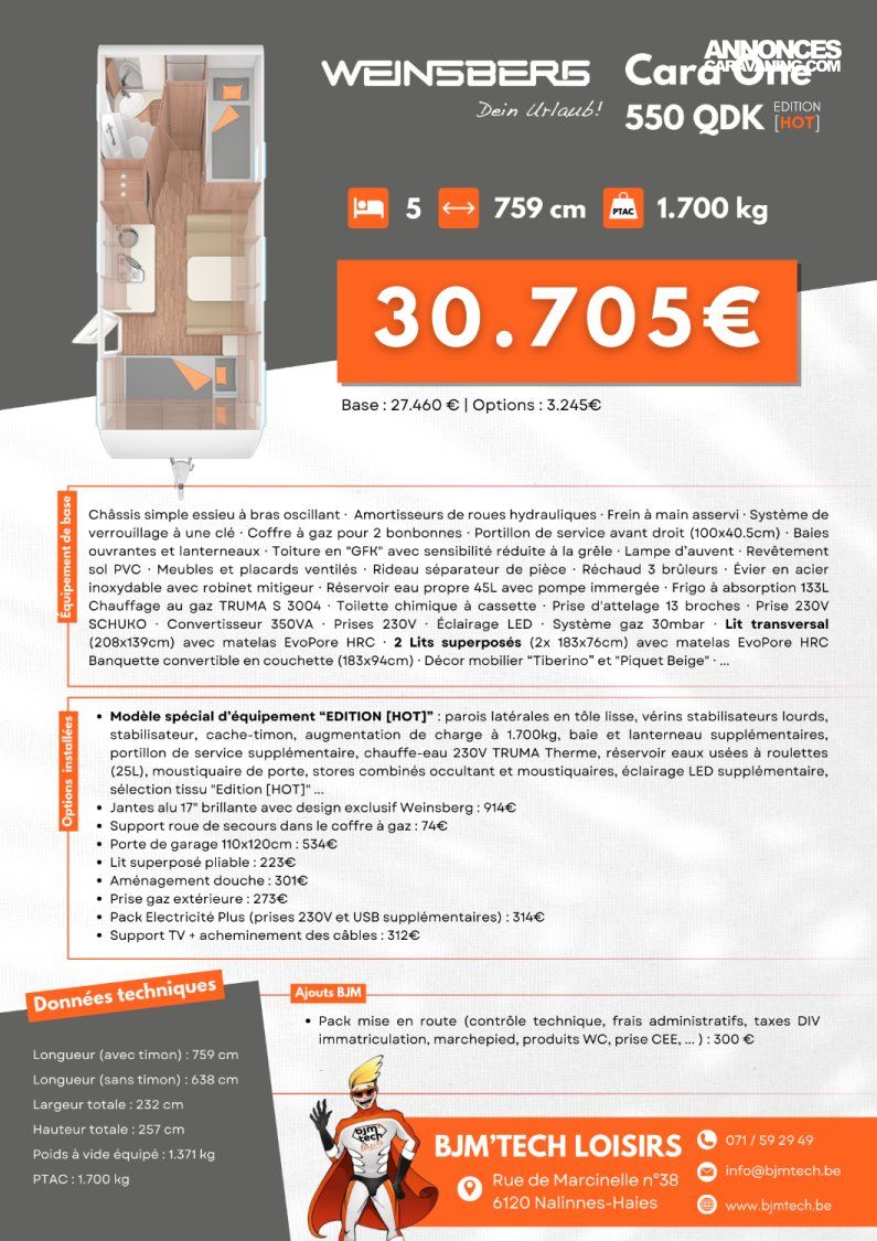 - Modèle spécial d’équipement “EDITION [HOT]” : parois latérales en tôle lisse, vérins stabilisateurs lourds, stabilisateur, cache-timon, augmentation de charge à 1.700kg, baie et lanterneau supplémentaires, portillon de service supplémentaire, chauffe-eau 230V TRUMA Therme, réservoir eaux usées à roulettes (25L), moustiquaire de porte, stores combinés occultant et moustiquaires, éclairage LED supplémentaire, sélection tissu "Edition [HOT]" ...