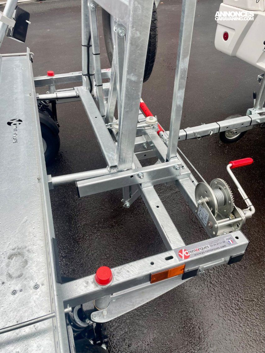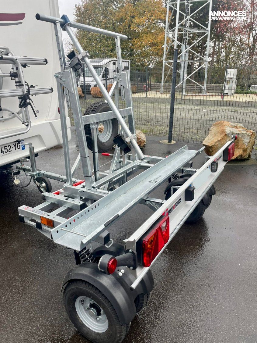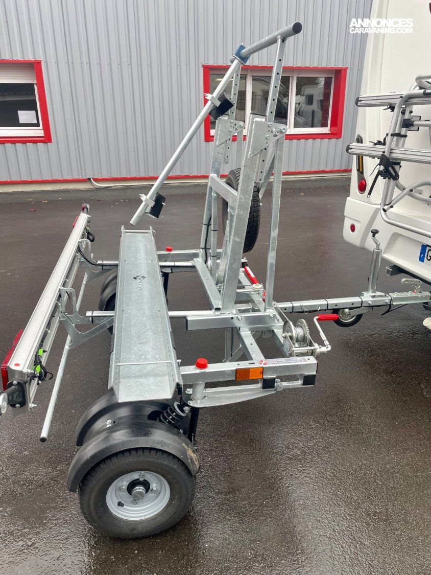 Remorque avec châssis tubulaire galvanisé à chaud. Système de biellette avec roues pivotantes qui permet d'effectuer des marches arrière sans difficulté (ATTENTION, utilisation uniquement en marche arrière) . Les roues jumelées sont dotées d'un système de blocage/déblocage rapide des pivots permettant une utilisation standard. Système de descente du rail au sol permettant le chargement seul en toute sécurité. Timon réglable en hauteur et en longueur adaptable à tous types d'attelage homologué.