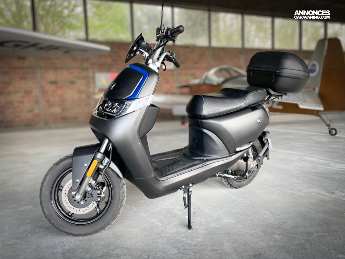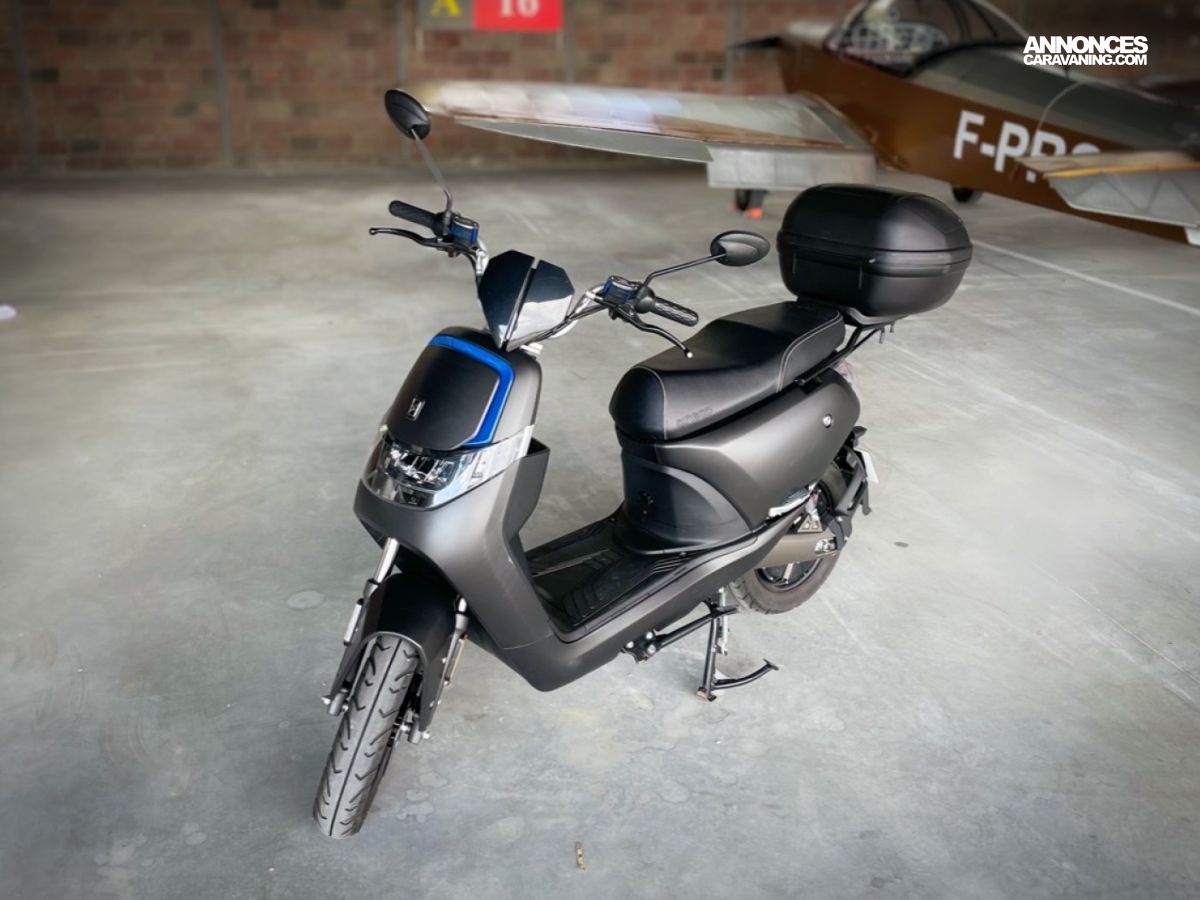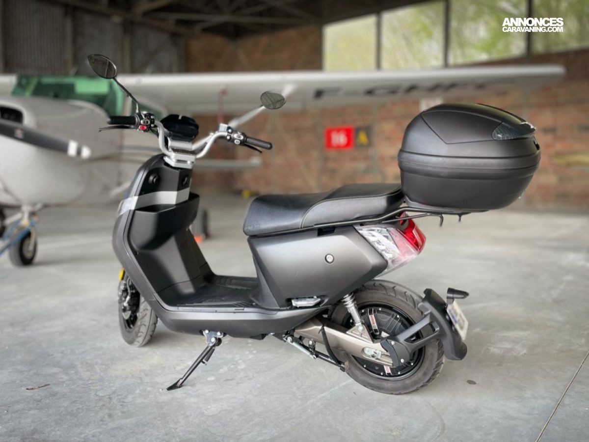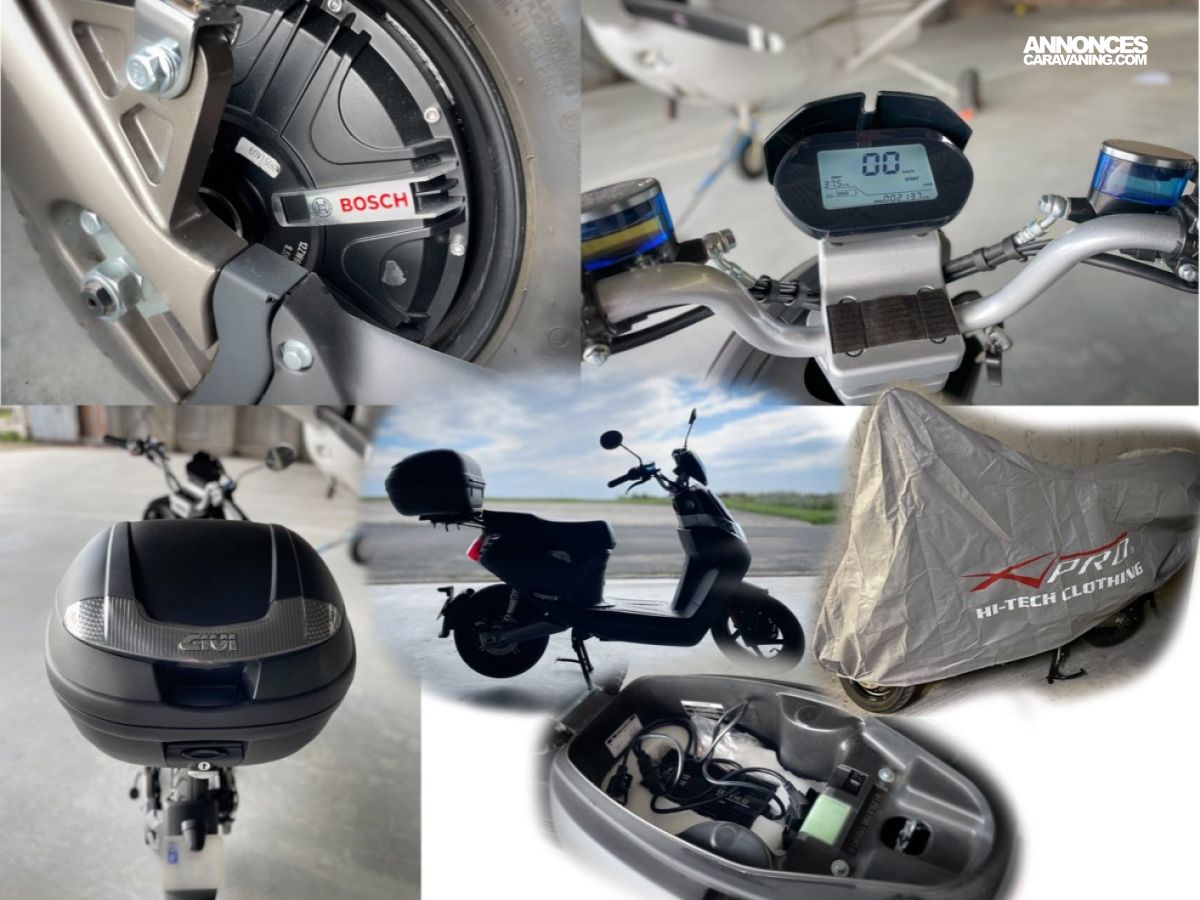 FICHE TECHNIQUE: • Moteur Bosch 2 100w • Batterie : Lithium-ion, 60 V 24AH • Capacité : 1.44 KWh / 2.88 KWh •- couple de 120 N-m Temps charge : 5 à 9 h • Autonomie : 50 km - 100 km • Dimensions : L1800 x l 690 x H 1150 mm • Empattement : 1265 mm • Hauteur de selle : 770 mm • Garde au sol : 160 mm • Jantes Alu 12 pouces • Poids : 78 kg - 88 kg • Freins : Disque av. / Disque arr. • Pneus Av. Ar. : 90/90-12 Principaux équipements: • Batterie principale amovible dans le plancher • Feux à LED • Tableau de bord électronique • Freins Av. et Ar. à disques • Tableau de bord électronique • Prise USB • Régulateur de vitesse • Mode Eco / normal /sport